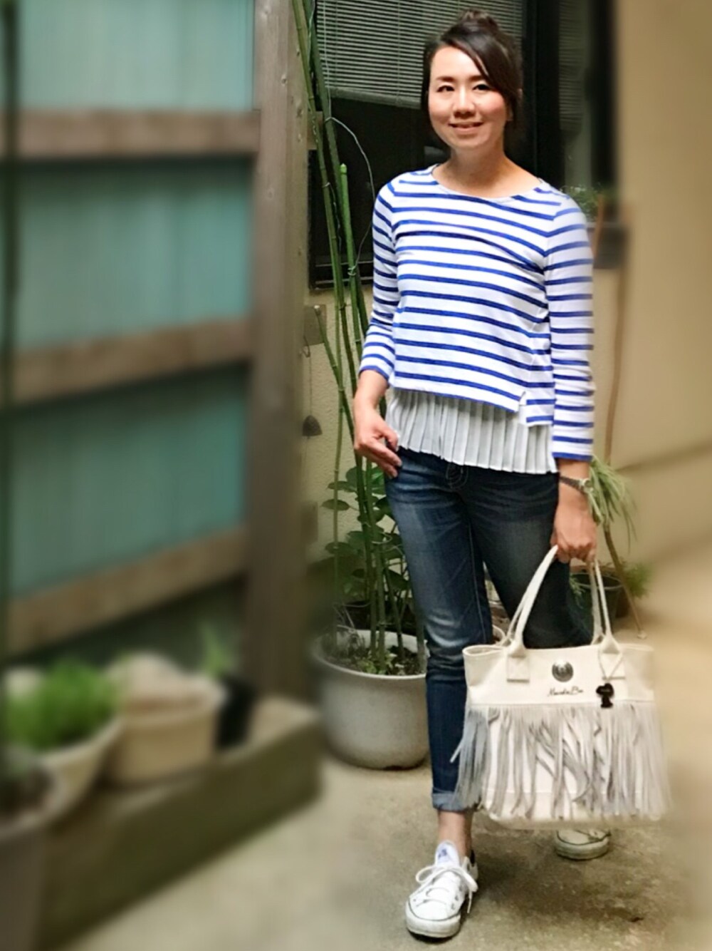 撮影コーデ。 主婦モデルなので親しみのあるカジュアルコーデ ボーダーのカラーも青でまとまりのあるカラーリングに。 気になる腰回りはキャミソールをレイヤードして華奢見せ。 シンプルボーダーも個性的なスタイルに。 足元はコンバースで爽やか休日コーデに。 フリンジバッグがシンプルコーデのスパイスに。