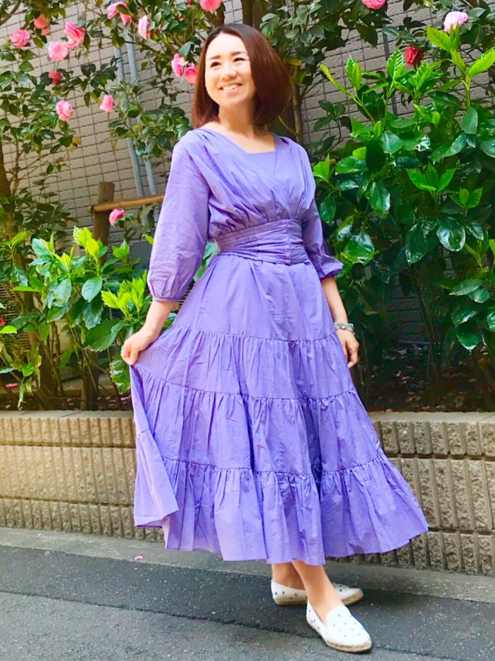 お気に入りの春ワンピースで休日コーデ❤︎ お休みと言っても建材の展示会にも行っているのでw 半OFFの日コーデ?! カシュクールとティアードのデザインが可愛いワンピースはスナイデル❤︎ リブランディングしてアラフォーも着たいと思うアイテムがちょいちょいあって嬉しい♪ 足元はLOVELESSの星スタッズスリッポンを合わせて♪ 太いベルトでウエストマークしてくれるメリハリワンピース❤︎ パープルのカラーもお気に入り♪