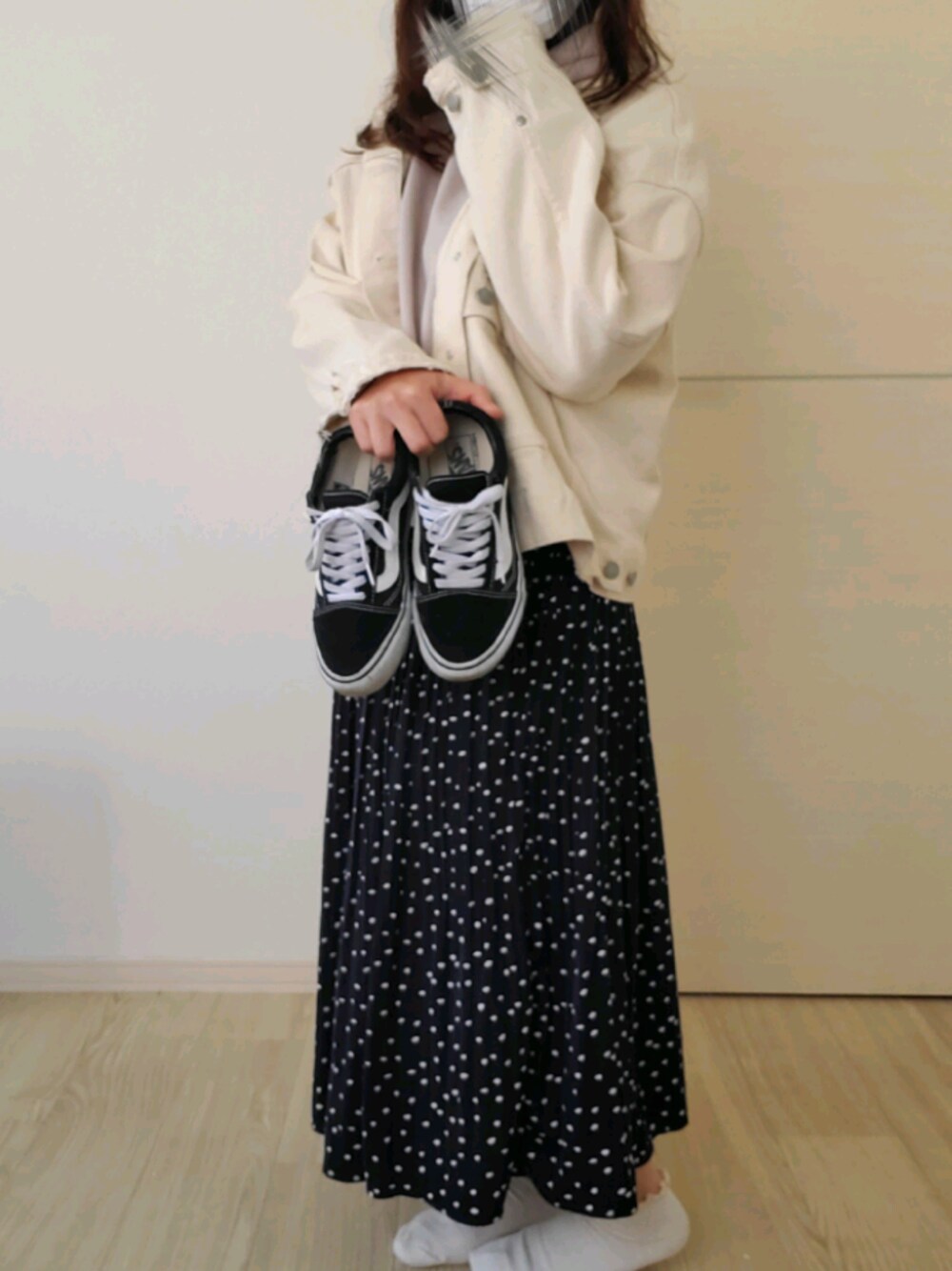 ご覧頂きましてましてありがとうございます✨ 春のお散歩コーデです! 近所の桜を見に行ってきました🌸 春らしく爽やかなホワイト×ネイビーの組み合わせです。 足元は歩きやすいスニーカーで👟