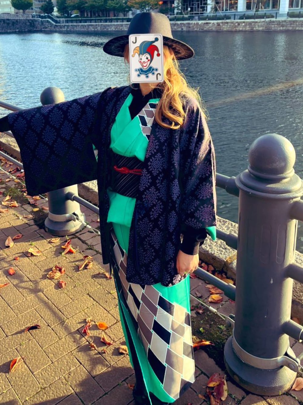 とにかく左右要素全部足し算 左はハットとジョーカーイメージの黒×紫コート 右はパーカーとサイクロンイメージの緑着物 帯は黒色+赤色の帯締めでWドライバーイメージ