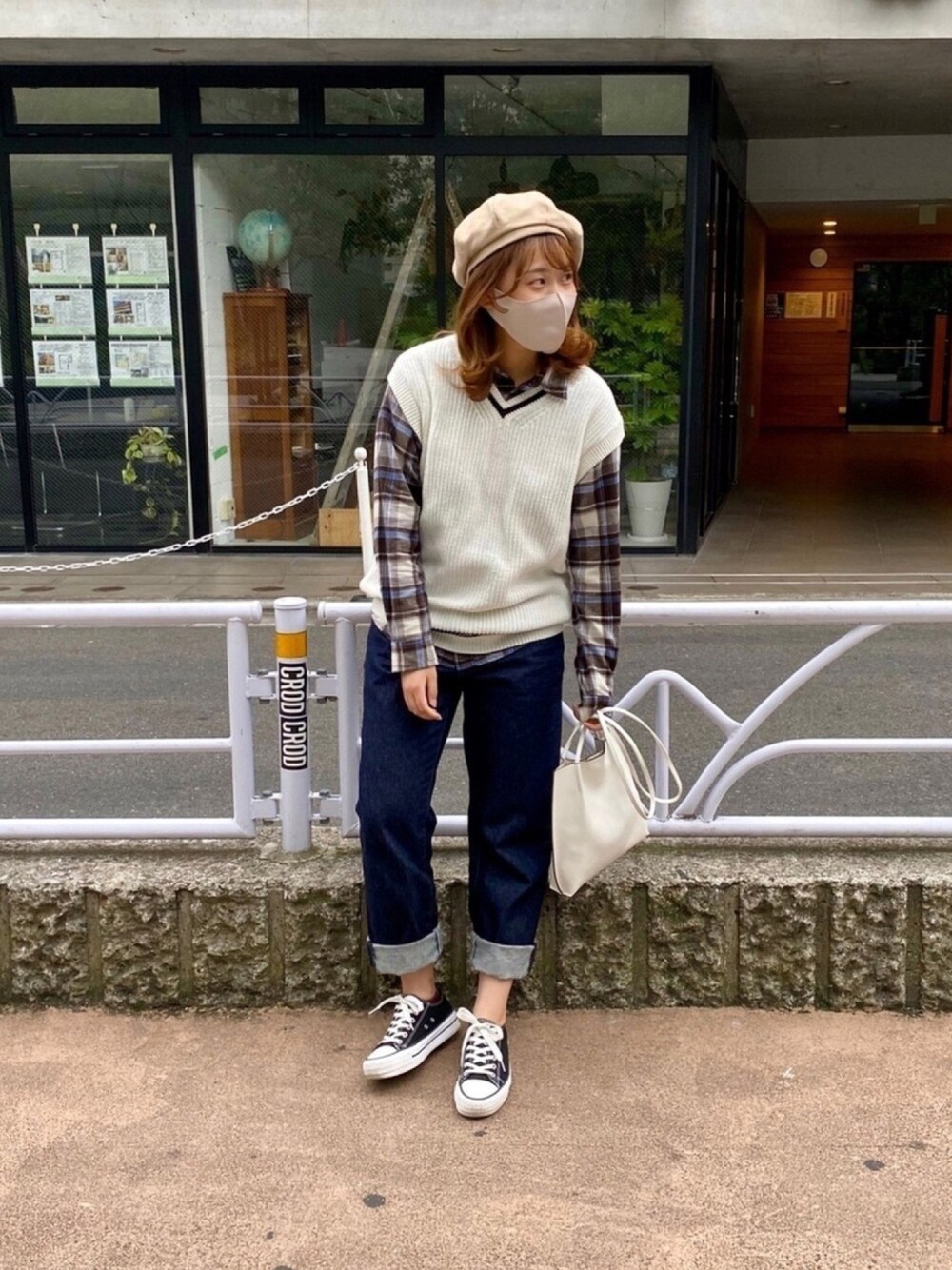 オールユニクロで秋の食べ歩きコーデ🍂 帽子は後ろ向きに、重心をずらしてベレー風にしてます このキャスケットはボリュームたっぷりで本当に可愛い!💕 色んなかぶり方ができてお気に入り😂✨ シャツとベストはメンズのMサイズで大きめに着てます😚