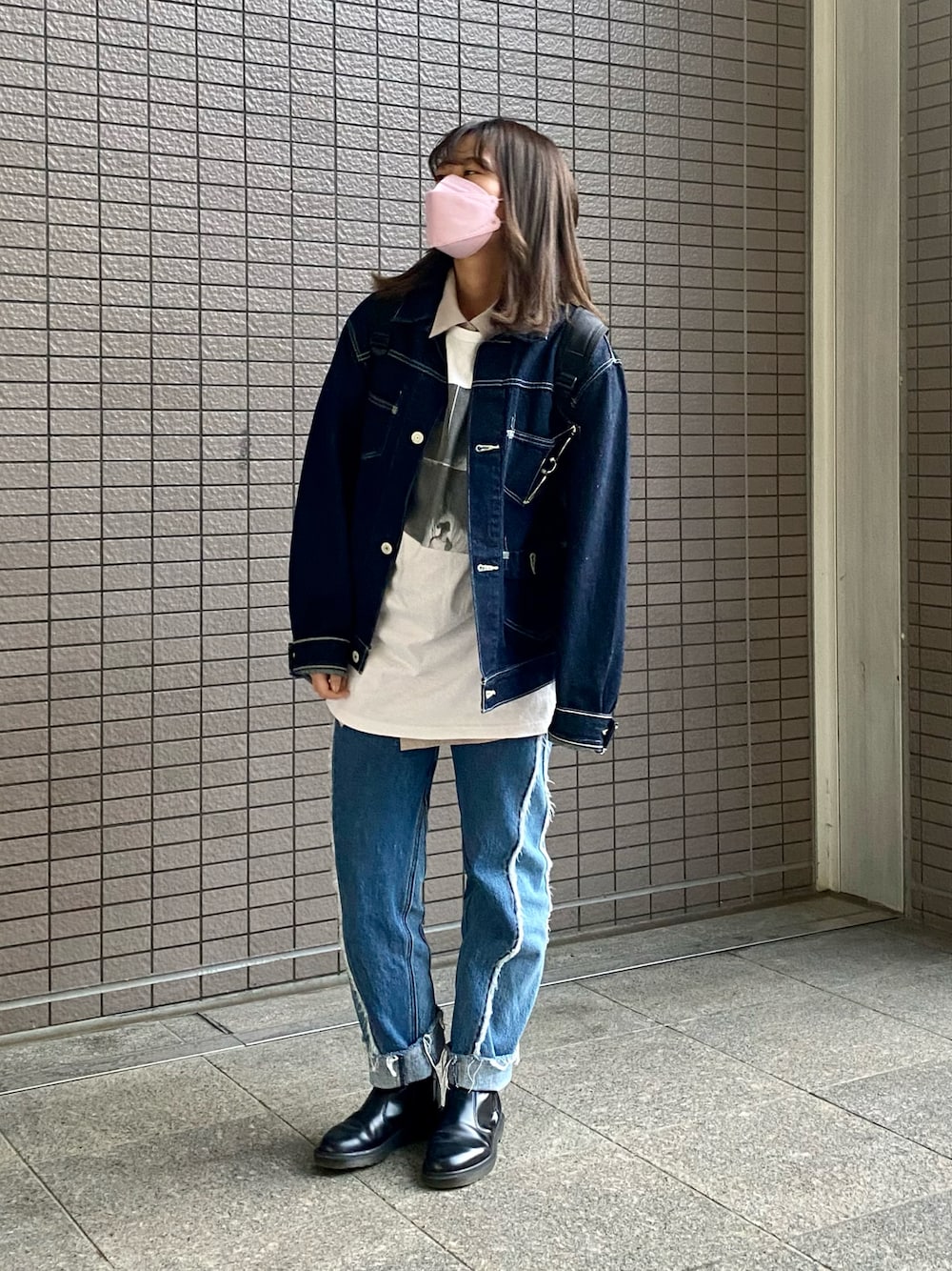 秋のデニムコーデ 白ステッチが可愛いリーバイスのオーバージャケットは柔らかいのに風を通しにくくて秋にぴったり🍂🍁 エッジの効いたデニムもセットアップ風の組み合わせにして襟付きシャツを合わせるとポイントになって可愛い