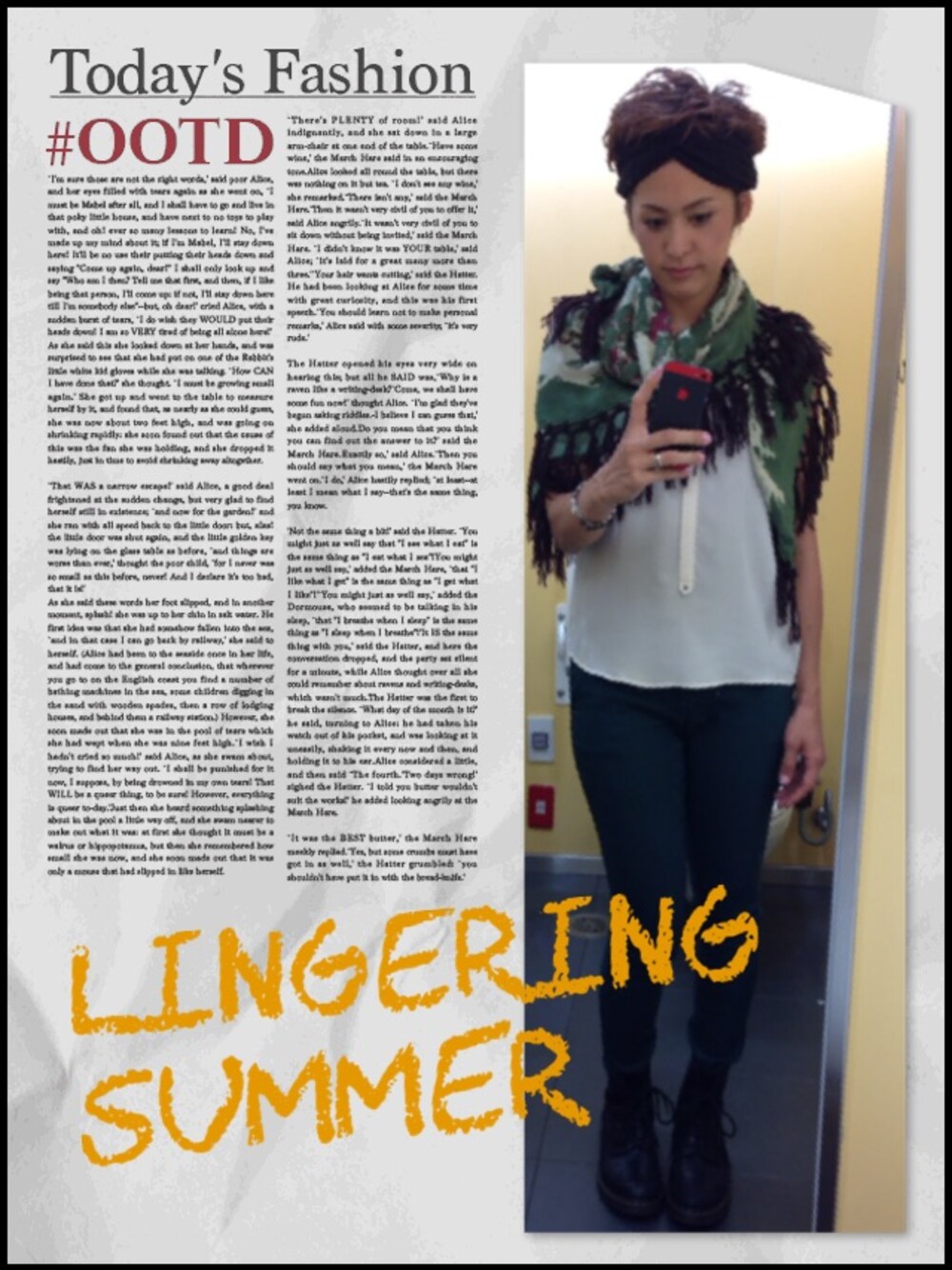 暑がりだから根強くノンスリーブだけど、一応10月だから取って付けたようにストールを巻く