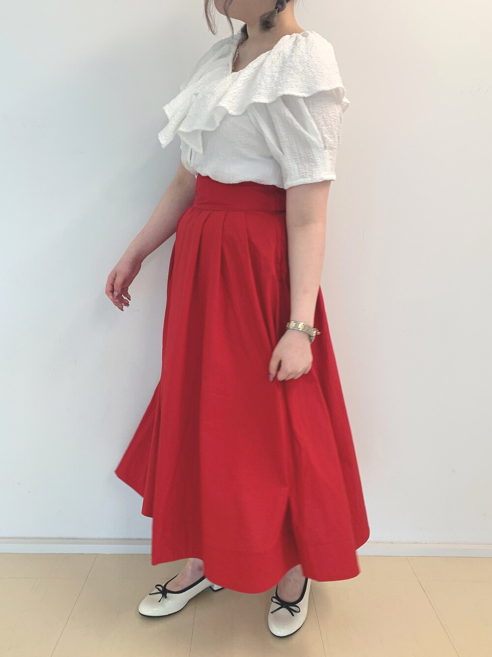 お洒落上級者見えする赤いスカート🥰 シルエットが綺麗すぎる💐 トップスはボタンの開け具合でオフショルにもなります。 素材が柔らかくて伸びるので着やすく サラッと涼しいので夏場に大活躍しそう𓂃 𓈒𓏸