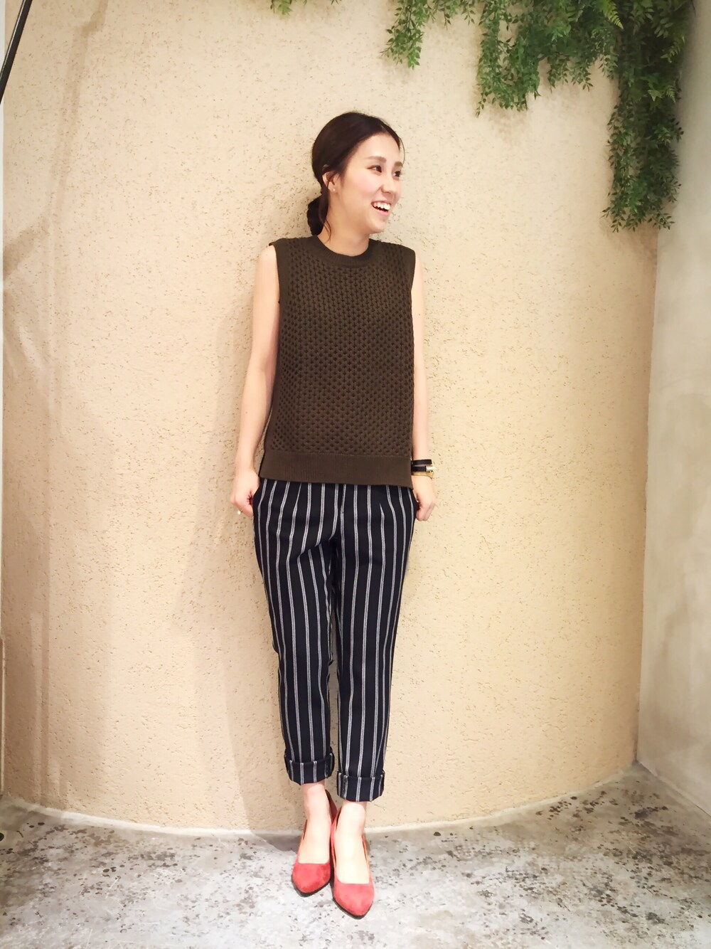大人気のニットベストスタイルを、本日もしてみました♪♪前回は、スカートスタイルでしたがパンツでかっこよくしてみました!パンプスの赤がポイントです!