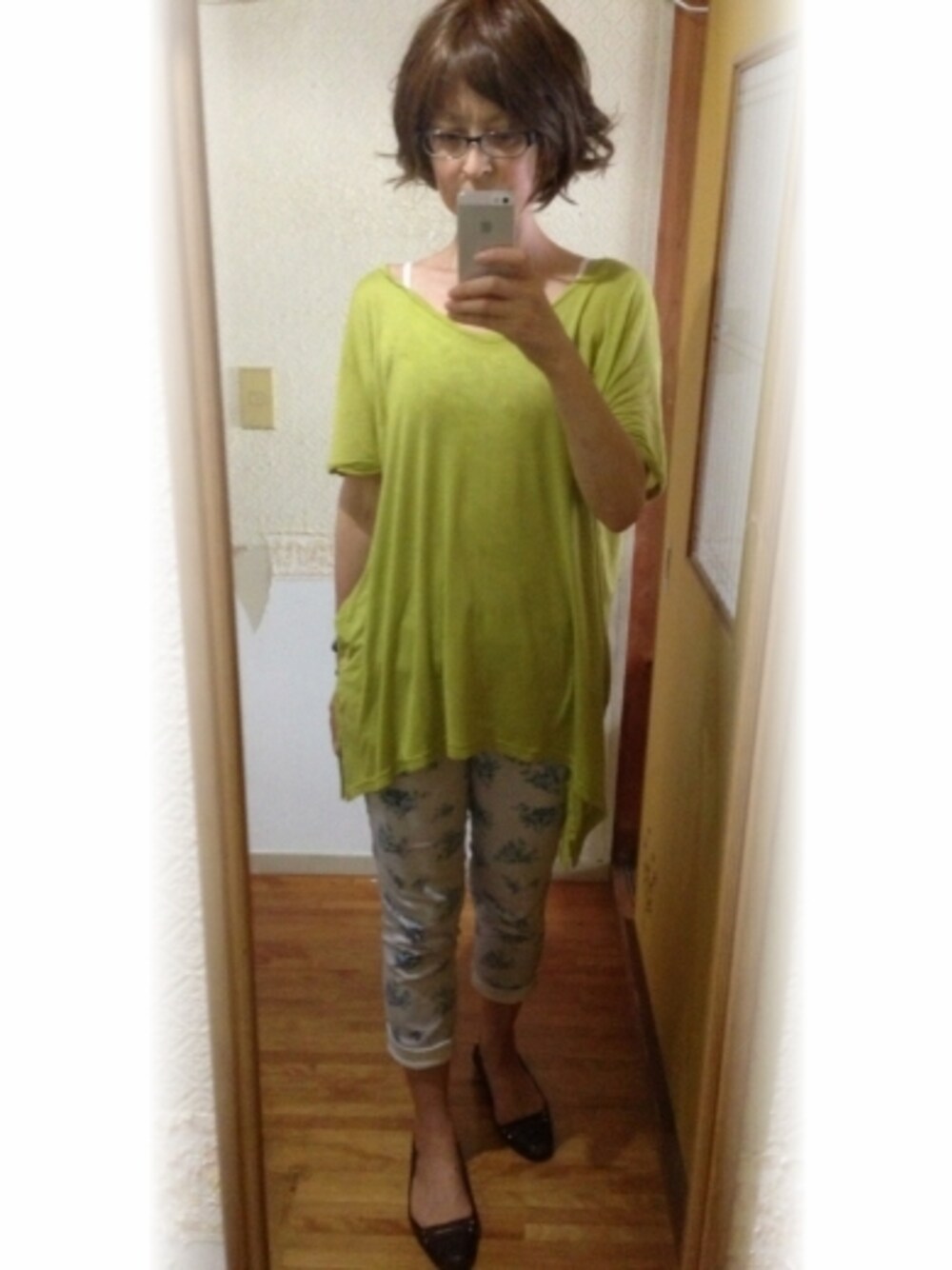 スモーキーなグリーンは使い勝手がいいね。 パンツが薄いブルーの花柄なんだけども、白あわせてもいいし、グレーや、紺色なんかでも相性よし。 上のビッグシルエットのTシャツもスモーキーな黄緑色であわせやすい。 白いパンツ、生成り、ブルー、もっと濃いグリーン、オレンジ色。 お花の色合わせと同じっていうか、葉っぱとおなじように考えたらお花にある色はなんでもあいそうだよね。 今日は梅雨もあけたかと思うほどに暑かったので、気分だけでも涼しく、元気になれるようなコーデにしてみました。 それにしてもあっついねー。