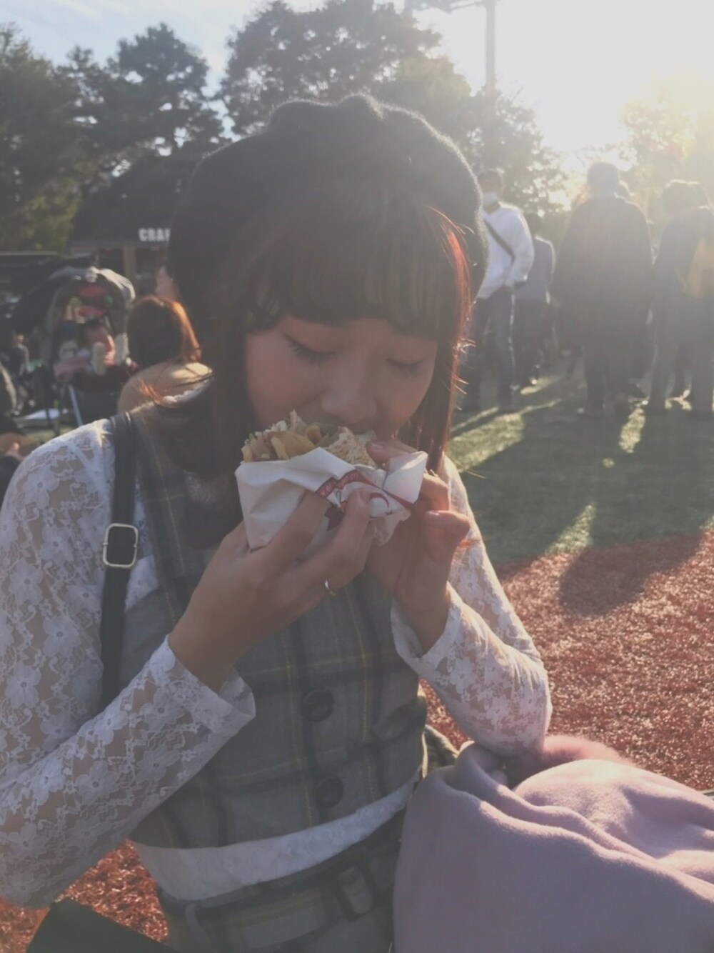 イチョウ並木を見に行った時の🍁🎑 ベレー帽の被り方イマイチわからんがこれで良いのか……😂 白レースは腕、二の腕細く見える!華奢に見える!サイコー🤤