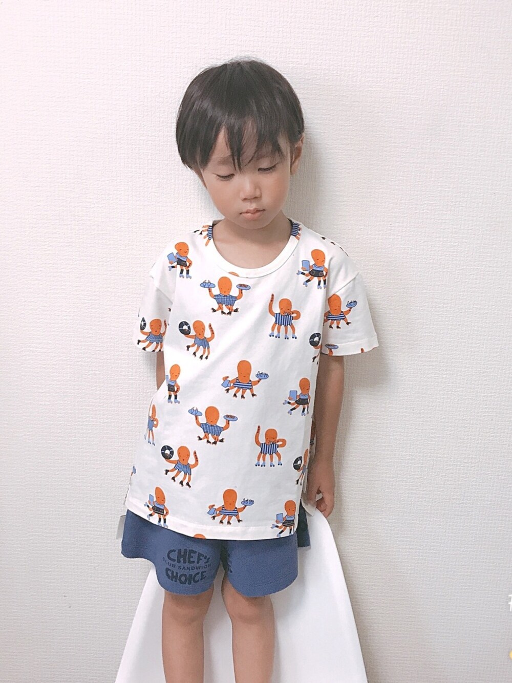 ホワイト系のTシャツ/カットソーを着用したキッズの夏コーディネートの1枚目の写真