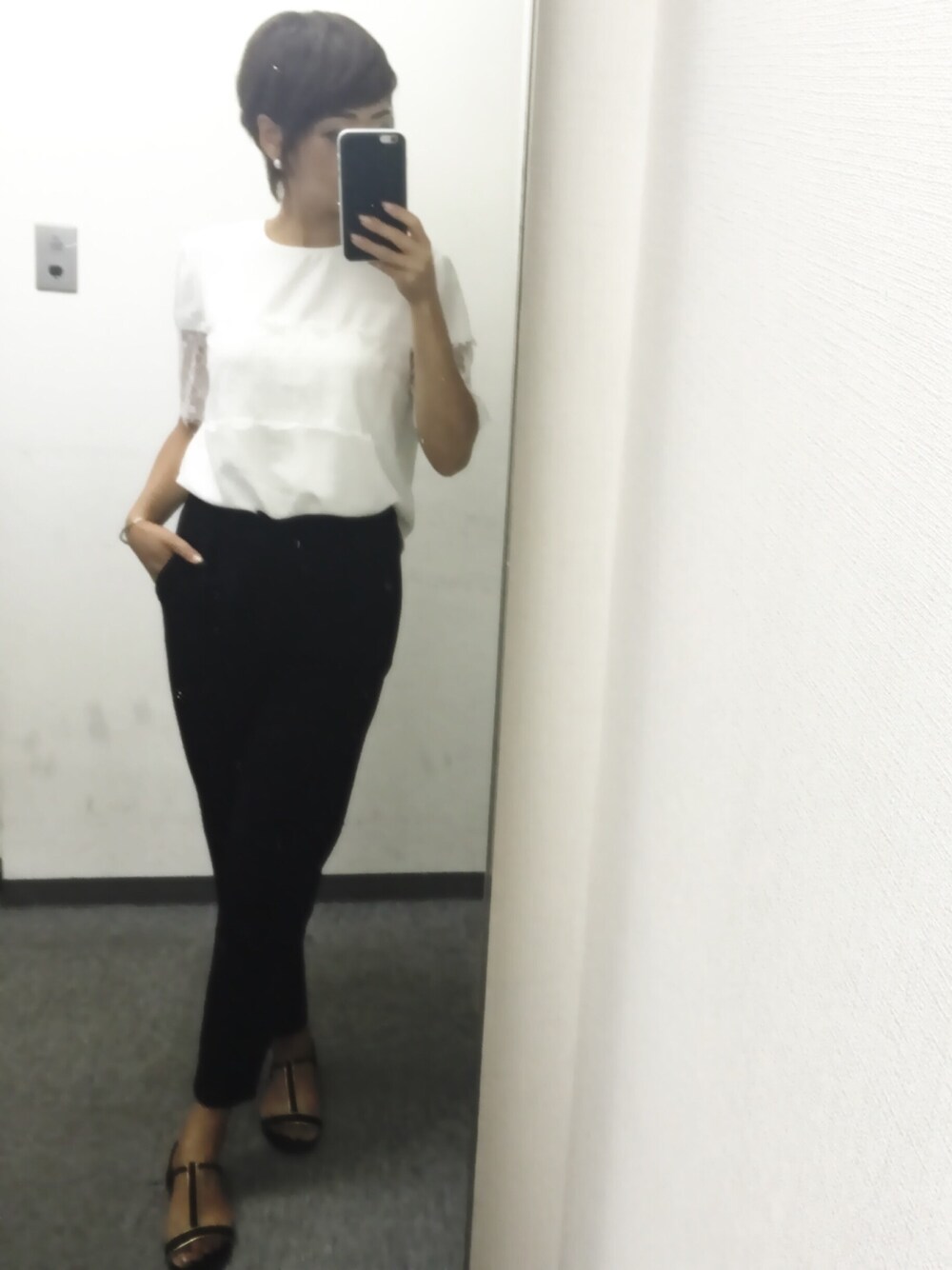 見えづらいですが、レースがついてる白ブラウスに テーパードPT♡ テーパードPTって体型カバーしてくれて楽チンで 今っぽさも出してくれる万能PT♡ 秋はcherieroseでも提案する予定でーす♡