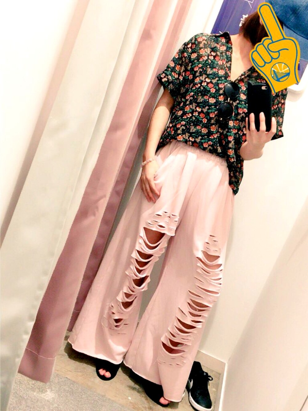 ヘビークラッシュスウェットワイドパンツ! ピンクとか被らない系がよき 花柄シャツでインパクトだしつつ〜 足元はブラックでキャップはデニムにした