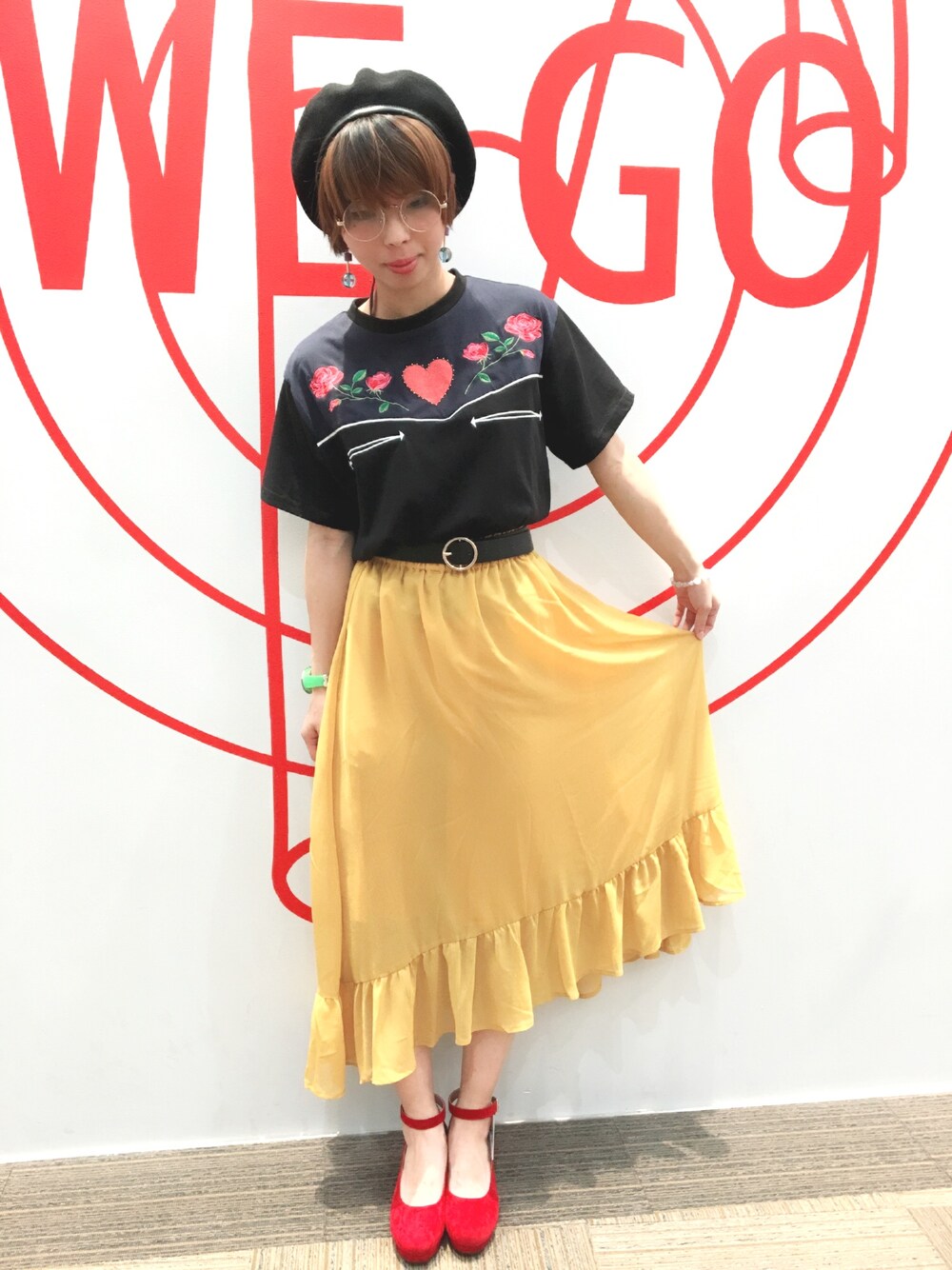先取り秋コーデ ボトムスがマスタードだからベルトは ベレー帽と同じ黒で統一させて 足元に赤をチョイスした! 全体的に重くなりすぎずにプラス控えめな感じも出したいから丸メガネをかけて トップスは締りのある黒で!