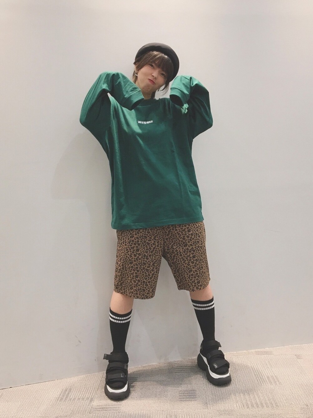 緑×アニマル柄すごく可愛くないですか??¨̮♡ メンズショーツを履く時は膝下のソックスで全体的なバランスをとってます! フィッシャーマンキャップってニットキャップとかローキャップとかと違う雰囲気だせるからすごく好き🥺 プロフィールにInstagramのアカウントを貼ってあるからそこから購入もできます!!