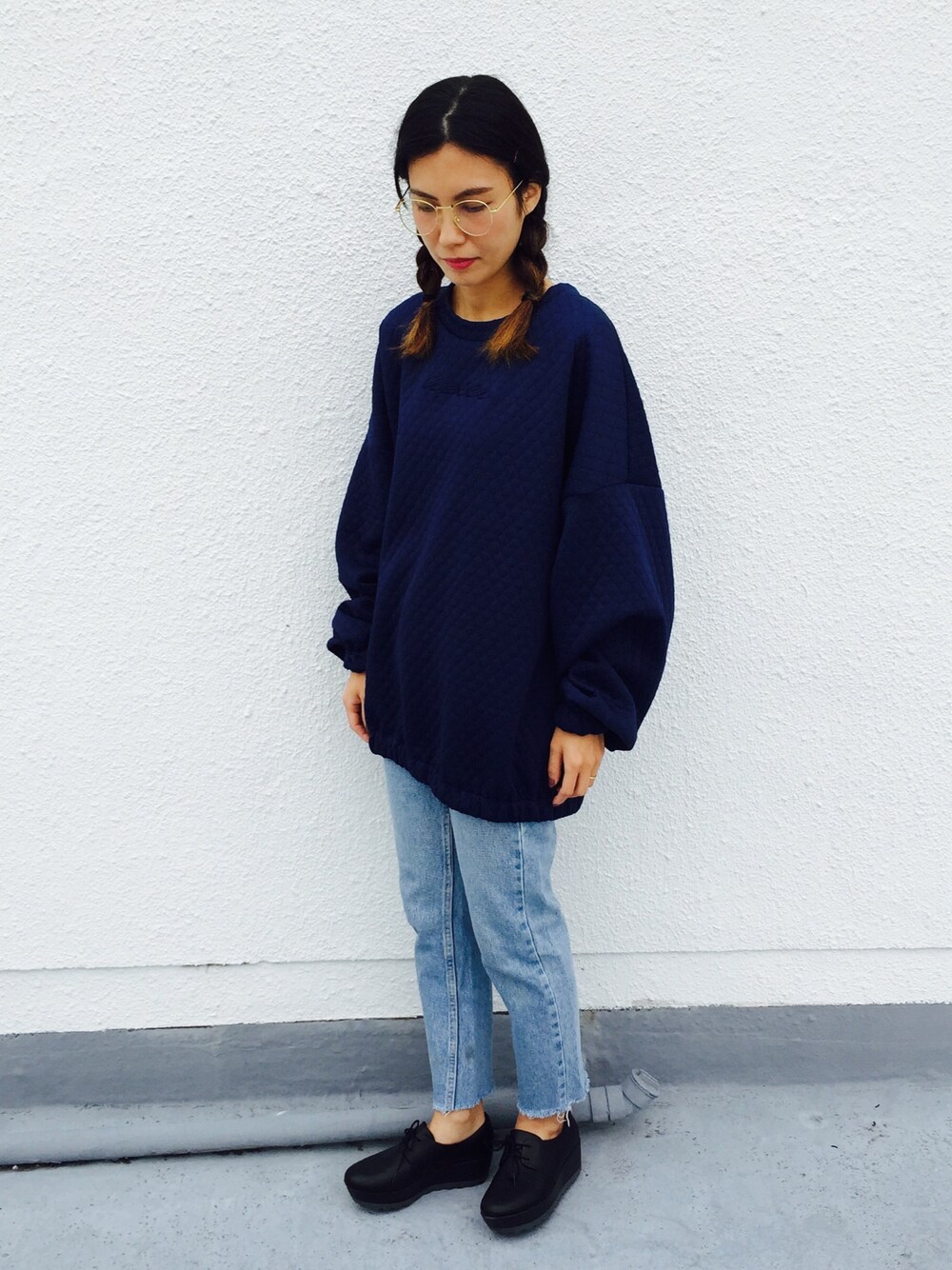 POURTON DE MOI(ポアトアデモア)のJACQUARD BOMBER TOP NAVYを 使ったコーディネイト。オーバーサイズのトップスをシンプルにブリーチデニム と厚底靴で合わせました。