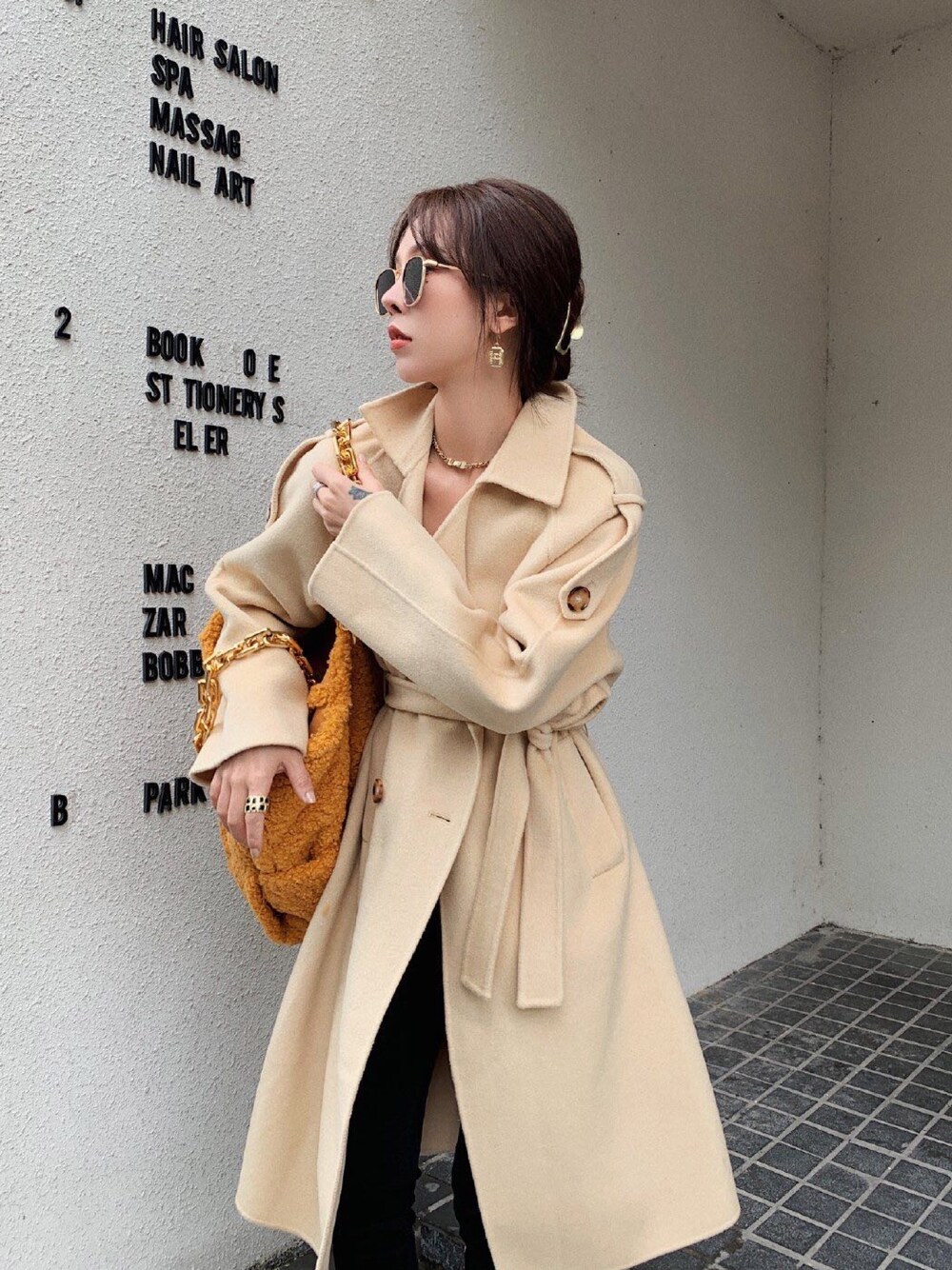 ベージュ系のトップスを着用したレディースの秋コーディネートの1枚目の写真