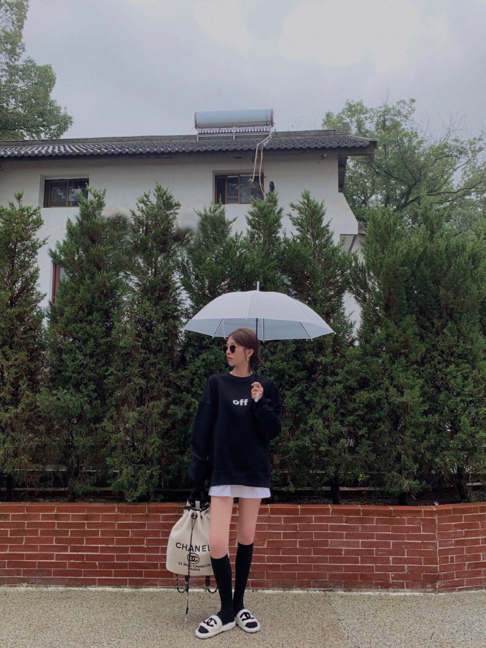 ブラック系のスウェットを着用したレディースの秋コーディネートの1枚目の写真