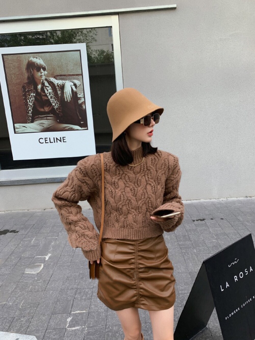 ブラウン系のニット/セーターを着用したレディースの秋コーディネートの1枚目の写真
