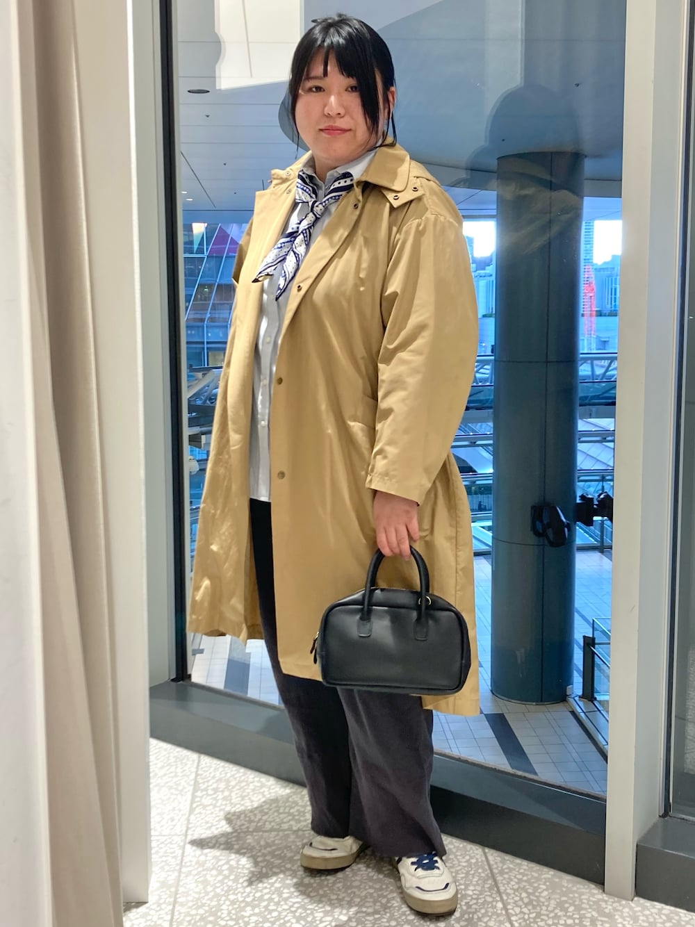 春にもおすすめなコート。 トレンチっぽいですが前上がりで 後ろがギャザーデザインです🫶 マニプリのスカーフと リアルバイで冬以外着てるワイドパンツ!