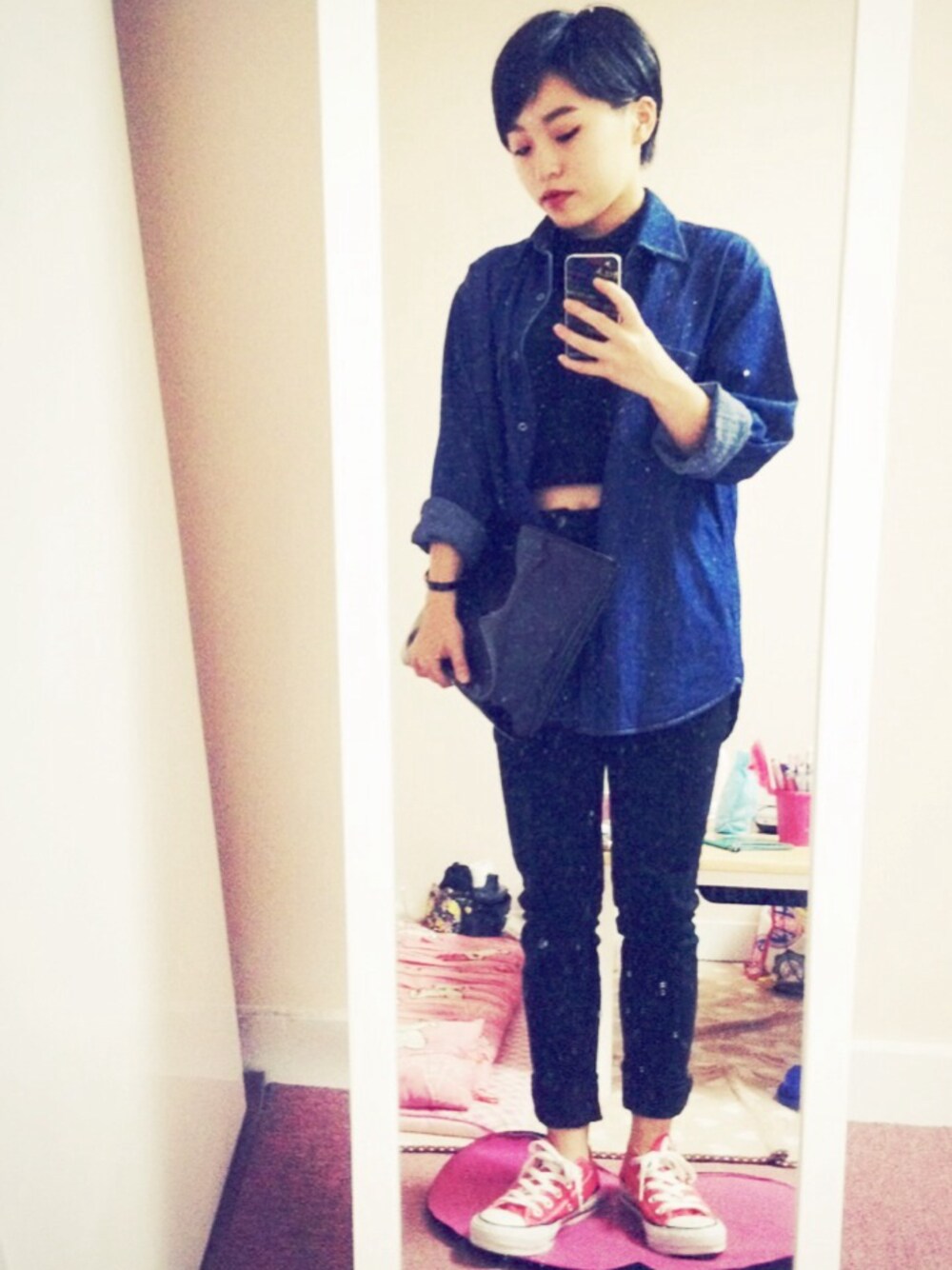デニムシャツ>>>used クラッチバッグ>>>moussy