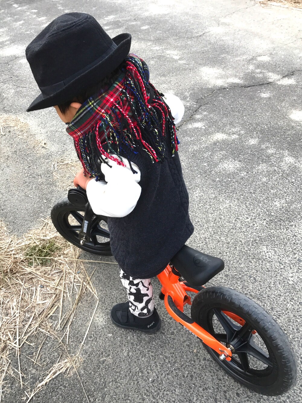 ご覧いただきありがとうございますm(_♡_)m いいね♡セーブ嬉しいです(*´꒳`*) クリスマスに実妹から貰ったお気に入りのジンジン(ストライダー)にご機嫌で乗る息子😊 女の子風コーデをハットで男の子っぽくしてみました☆
