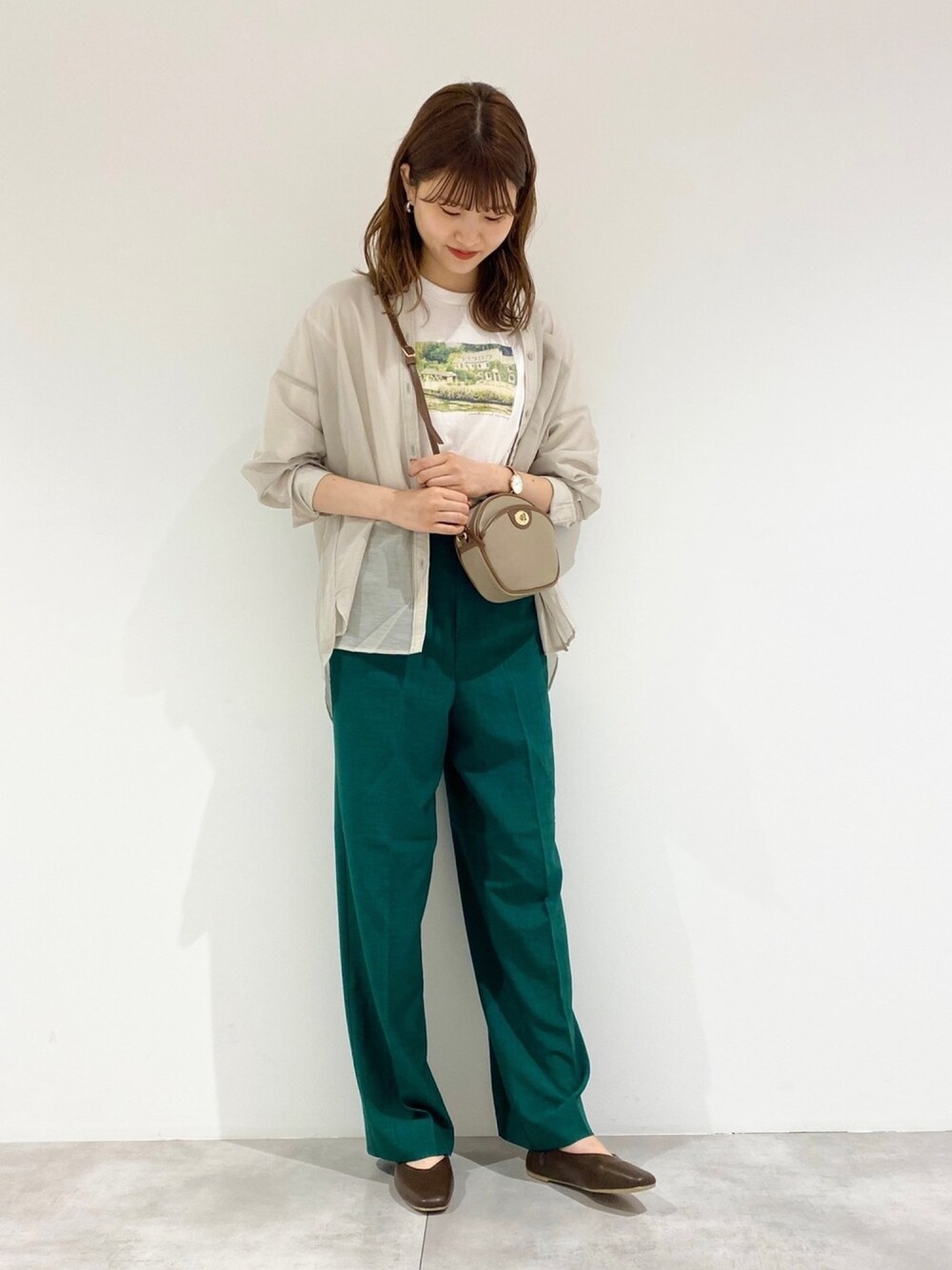 鮮やかなグリーンのパンツでのコーディネートです🌿 センターラインが入っていて シルエットがとても綺麗で履きやすいです!