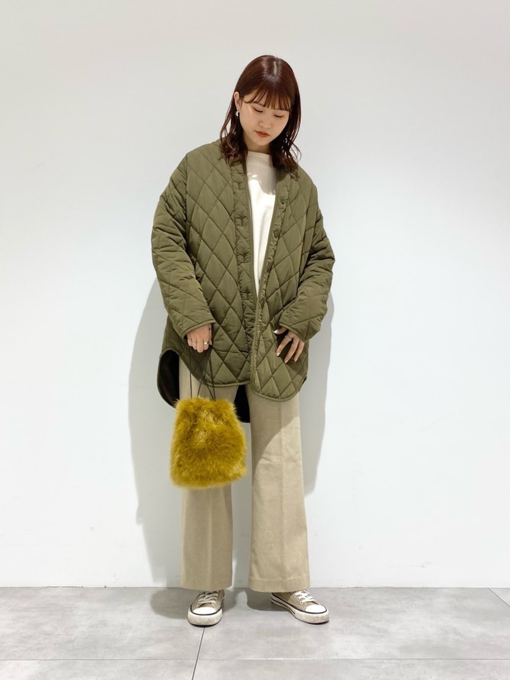 aのノーカラージャケット「リバーシブルキルティングボアコート」を使ったコーディネート