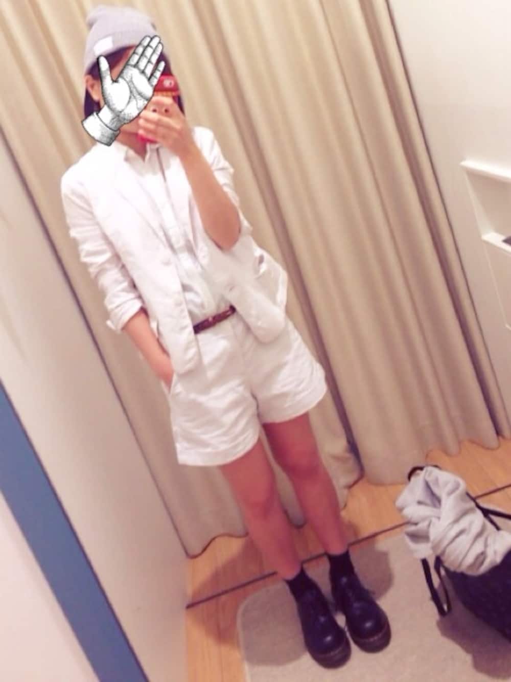 GUのストライプ柄のセットアップ。 中は白シャツ。