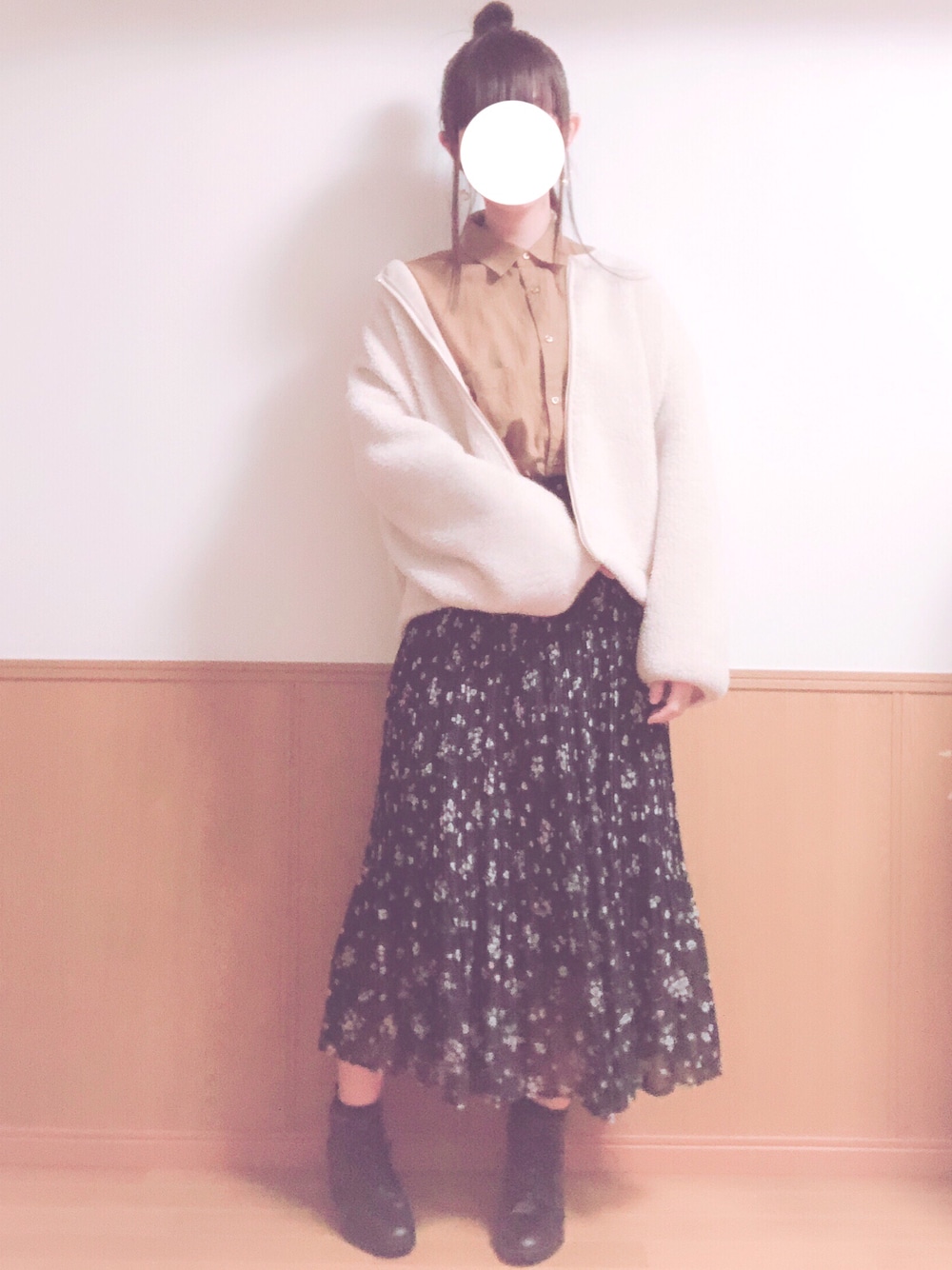 こんにちは、こんばんわ✨ いつかのコーデです🤥 うほっ…💕 黒のプリーツスカート可愛ないですか? 花柄で春用なんですけど、タイツ履けば全然いけるし、ロング丈は使いやすい…って、切実に思います🍼 お団子、この前見たく上手くできんかったわ😭