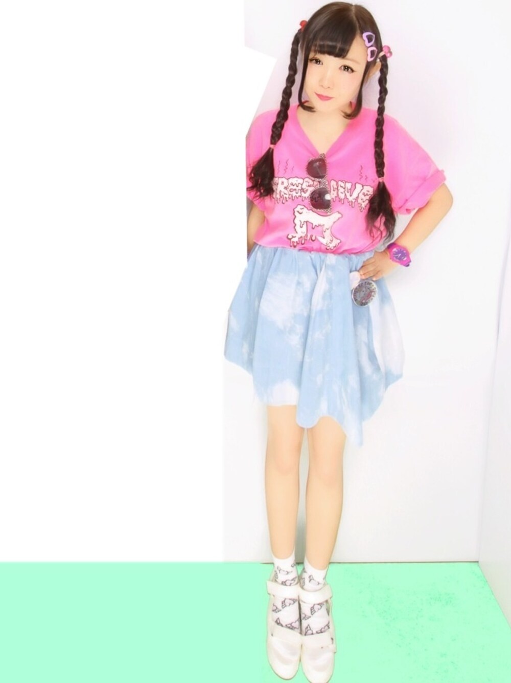 Tシャツ:古着屋 スカート:蔵之助 ソックス:WEGO ヘアピン:WEGO 時計:39マート