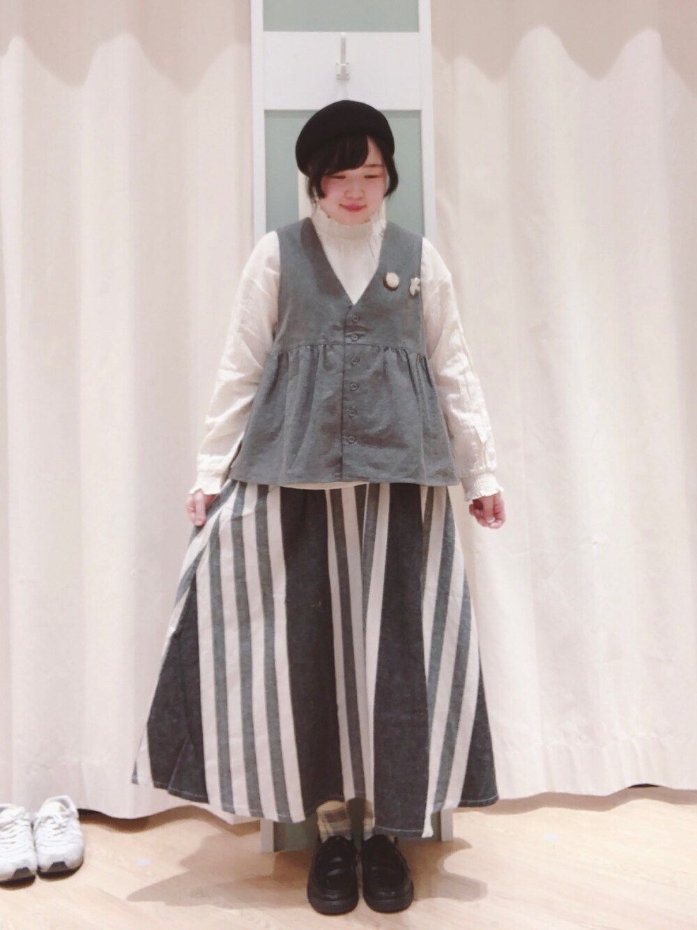ベストとストライプスカートを合わせてみました! ベストは見た瞬間に欲しい!と思って購入してしまいました🐻💓 シンプルに着こなしたいので今回はグレーにしました!黒パンツとかでも絶対かわいいです!