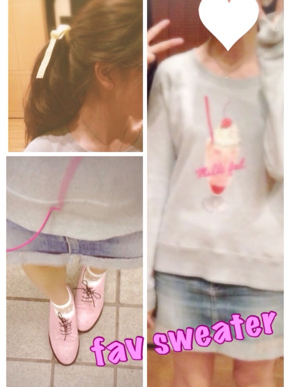 全身の写真がぼけぼけ… 寒くなってきたのでスウェットが着れますね♡ 大好きなパフェプリントと、最近大活躍のお靴〜 ピアスはパフェプリントに合わせてピンクとミントの二つを付けました。ポニーテールに付けてるのは黄色×白ギンガムのリボンです(^ν^) 甘々にならないようボトムはデニムのタイトスカート!