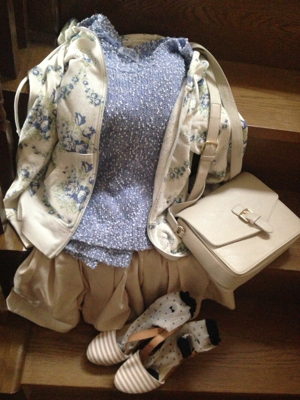 先日のちょっとだけ寒かった日のoutfit :) 去年買ったパーカーの柄がとってもお気に入りなのです♡ Cabbages&roses print parka...UNIQULO Beige flare skirt...Lowry's Farm See through navy dot socks...tutuanna