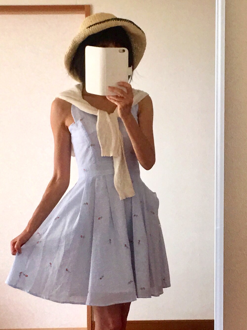 夏は涼しげなワンピが1番‼️ このワンピ、ポケットついててうれしい💕 コーディネートってほどでないけれど、 冷房対策のカーディガンと夏帽子で 久しぶりのお出かけです(*´∇`*)🍒