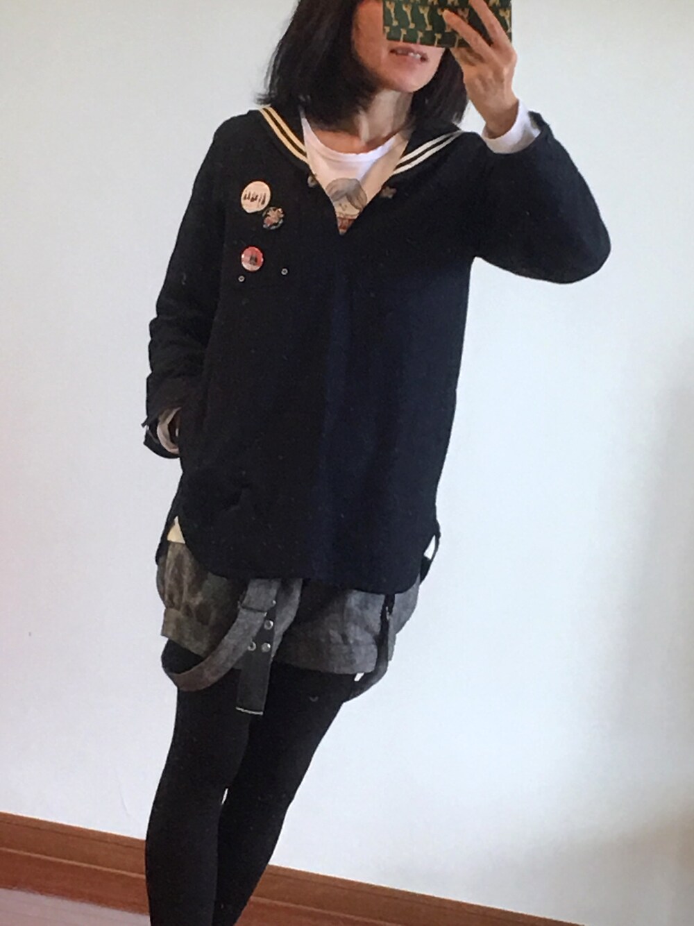 ポイントはセーラーカラーからのぞく子どもの顔プリント☆ そして、3つついてる缶バッジ☆1つはもちろんShine4ever です! このコーデ大好きですが、後ろ姿が中学生(^^;;