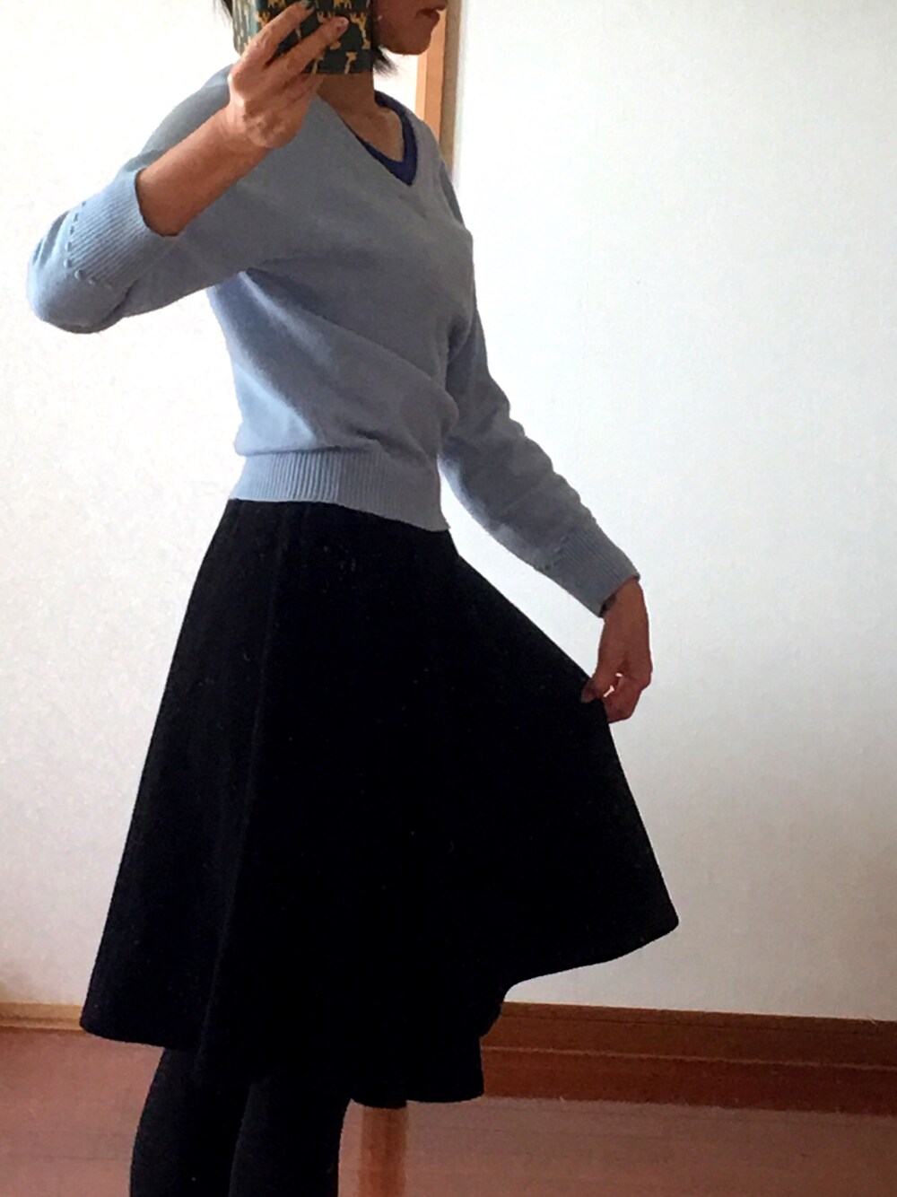 オールブルーコーデです。首まわりをあけると、セーターでも春らしくなりますね♫ ちょっとバレエっぽくないですか?