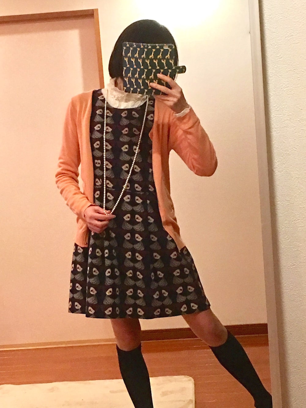 ピンク系のガラスパールのネックレスがポイントのコーデ。ワンピは原宿で見つけた不思議な柄。 春色カーディガンで暗くなるのを防いで?います。 ٩(๑❛ᴗ❛๑)۶