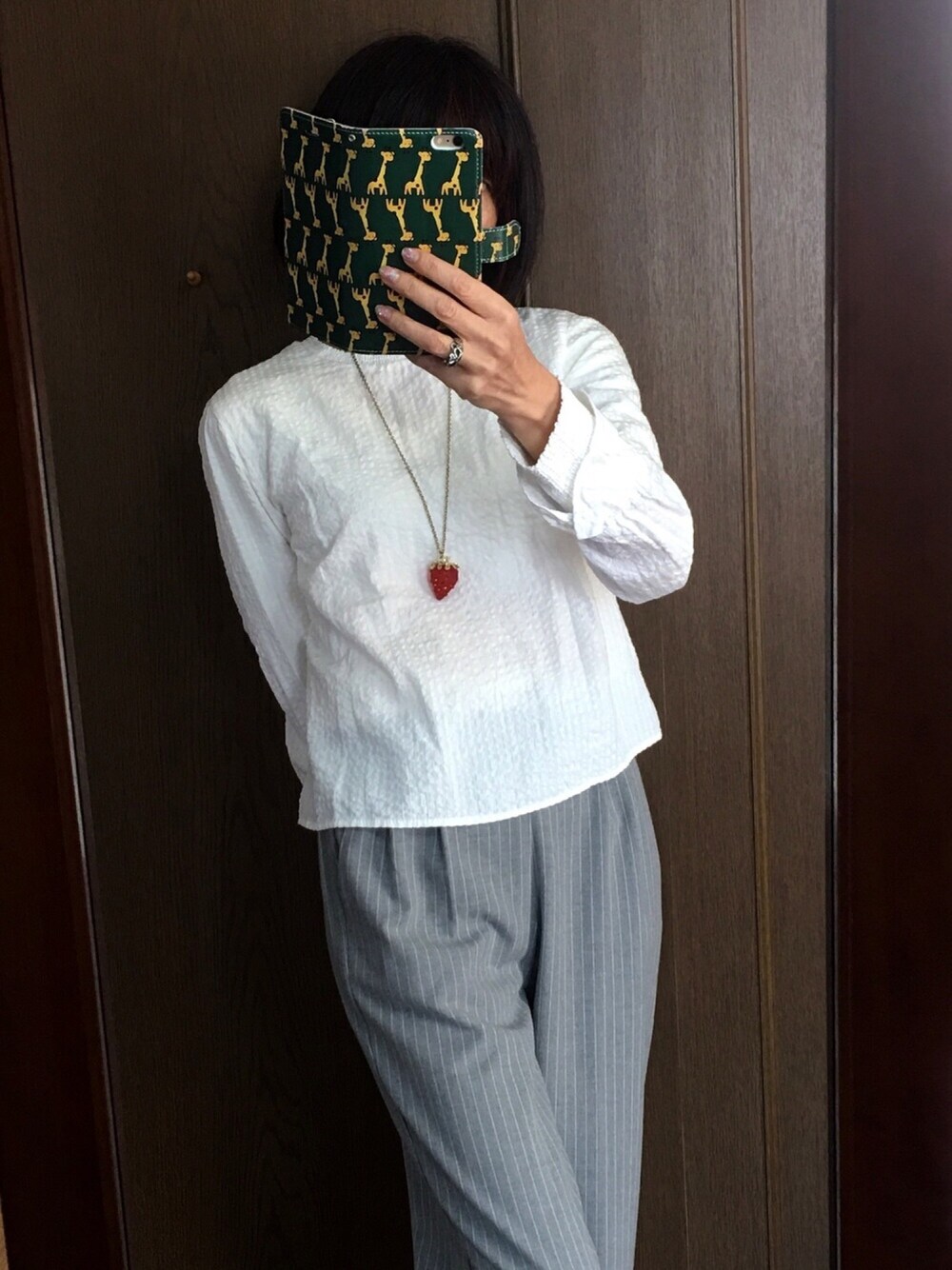 ポイントは何と言ってもいちごのネックレス🍓 パンツは150サイズの子ども用。 シンプルだけど、二重袖の丸首ブラウスと🍓で カジュアルガーリー(*´꒳`*) いちご狩いきたいなぁ〜〜♫