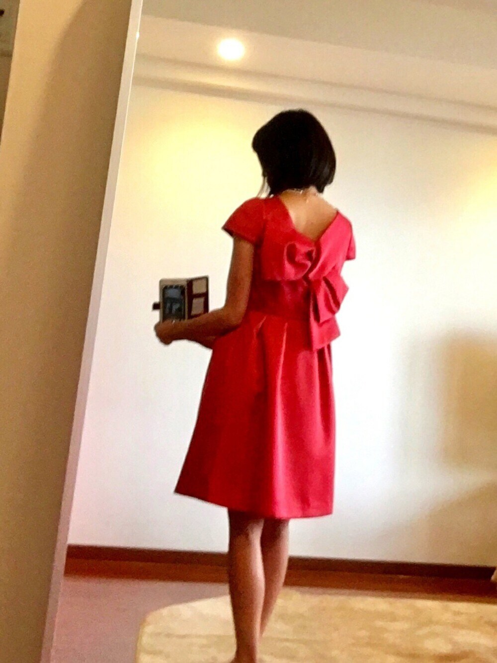 背中のリボンがお気に入り!! 結婚式用に買ったワンピース♫ 赤に近いピンクのワンピは初めてでうれしいな(*^▽^*) オトナだからこそ似合うようになった気がするのです。