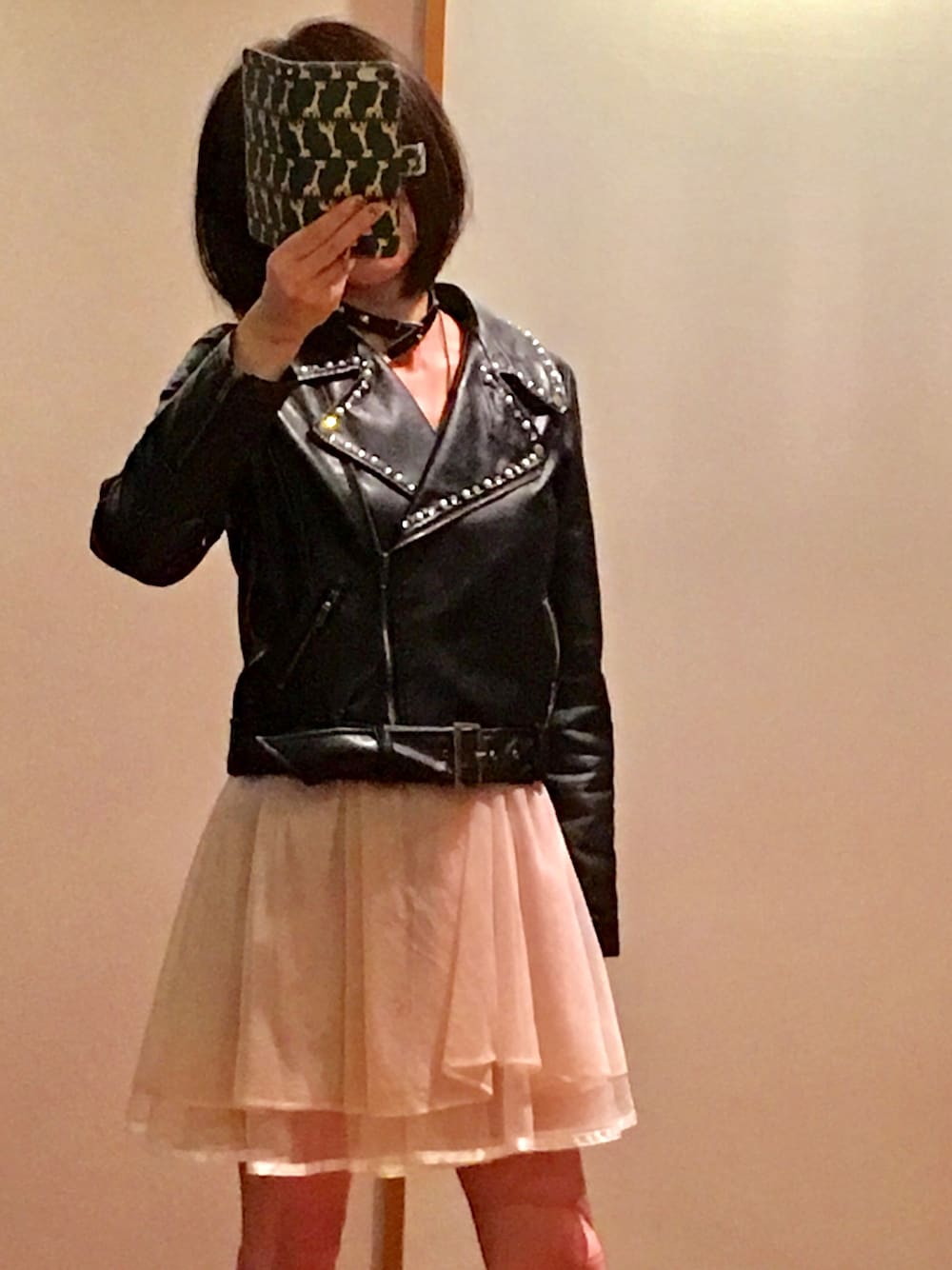 パーティードレス風のミニワンピは古着。ライダースで甘辛ミックスしてロック★スタイル〜╰(*´︶`*)╯♡ 首輪風のチョーカーがポイントです♫