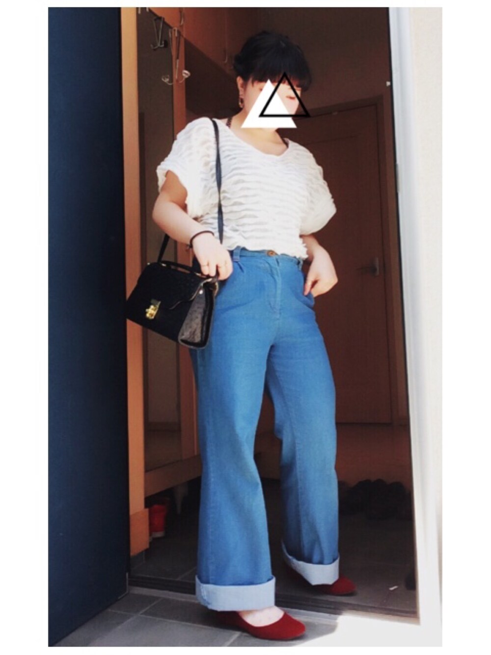 暑くて 半袖です … mysticのトップスが ひらひら可愛い 。 赤のパンプスで差し色 👠👠 やっぱシンプルすき !
