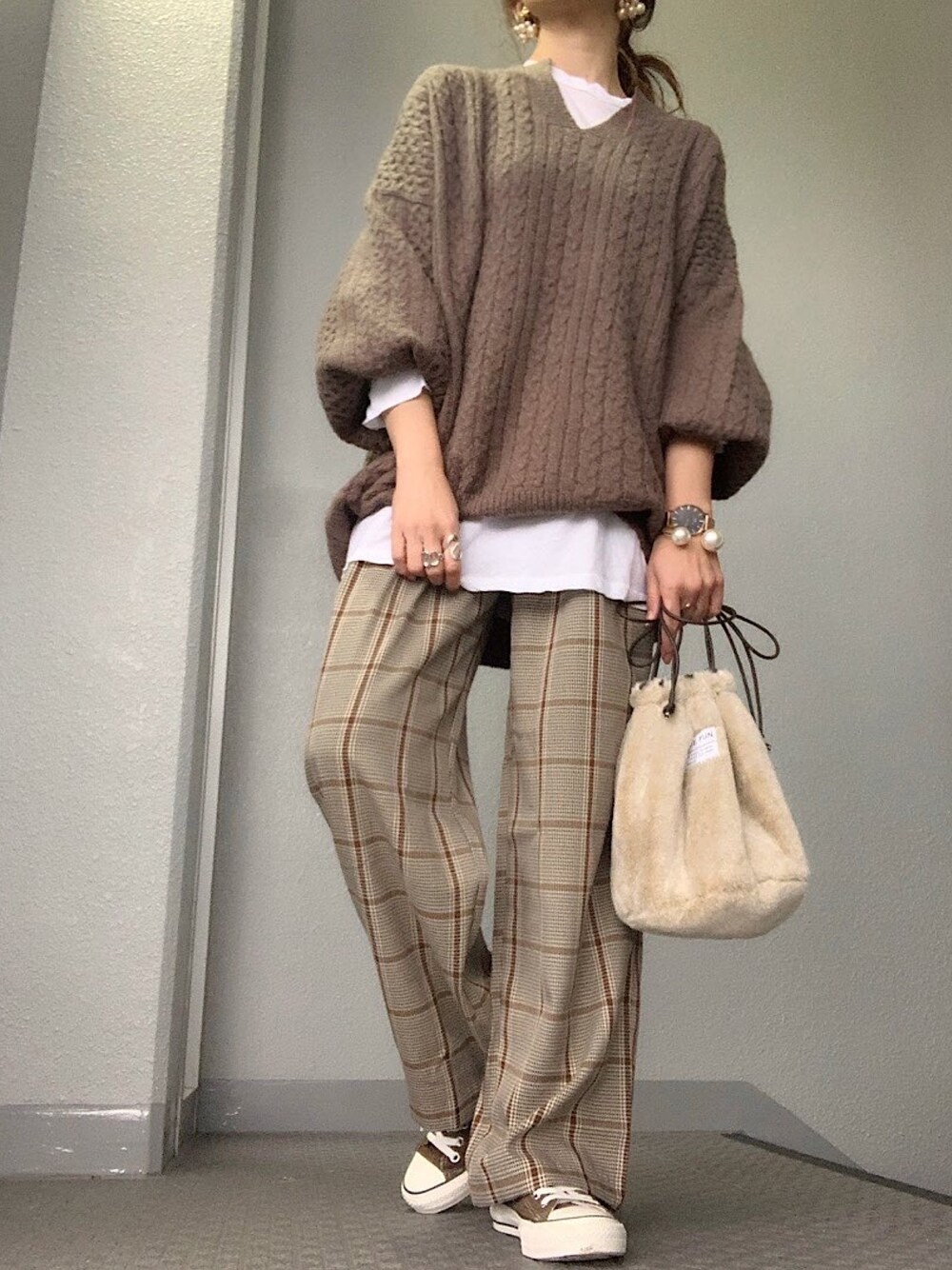 キーネックケーブルニットはもちふわで着心地最高‧✧̣̥̇‧ ゆるっと楽チンコーデ❥❥❥ Instagram:chery0131