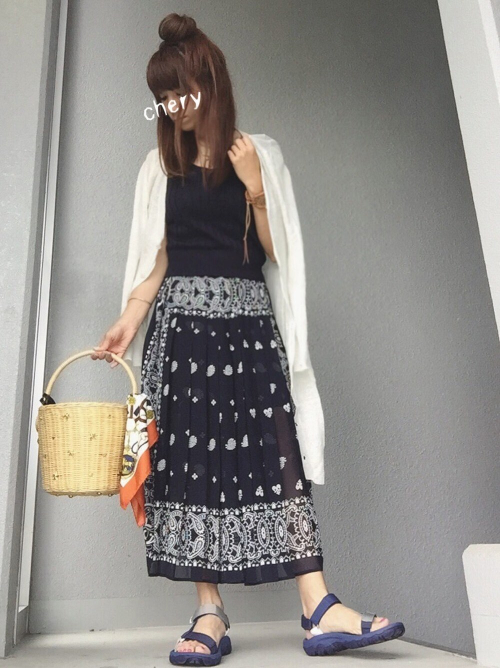 予約していたバンダナ柄スカートは、プリーツになっててめちゃくちゃ可愛い〜(*´³`*)♥︎✧‧˚ ネイビー×ホワイトで、涼しげにコーデしました♥︎∗*゚ Instagram:CHERY0131