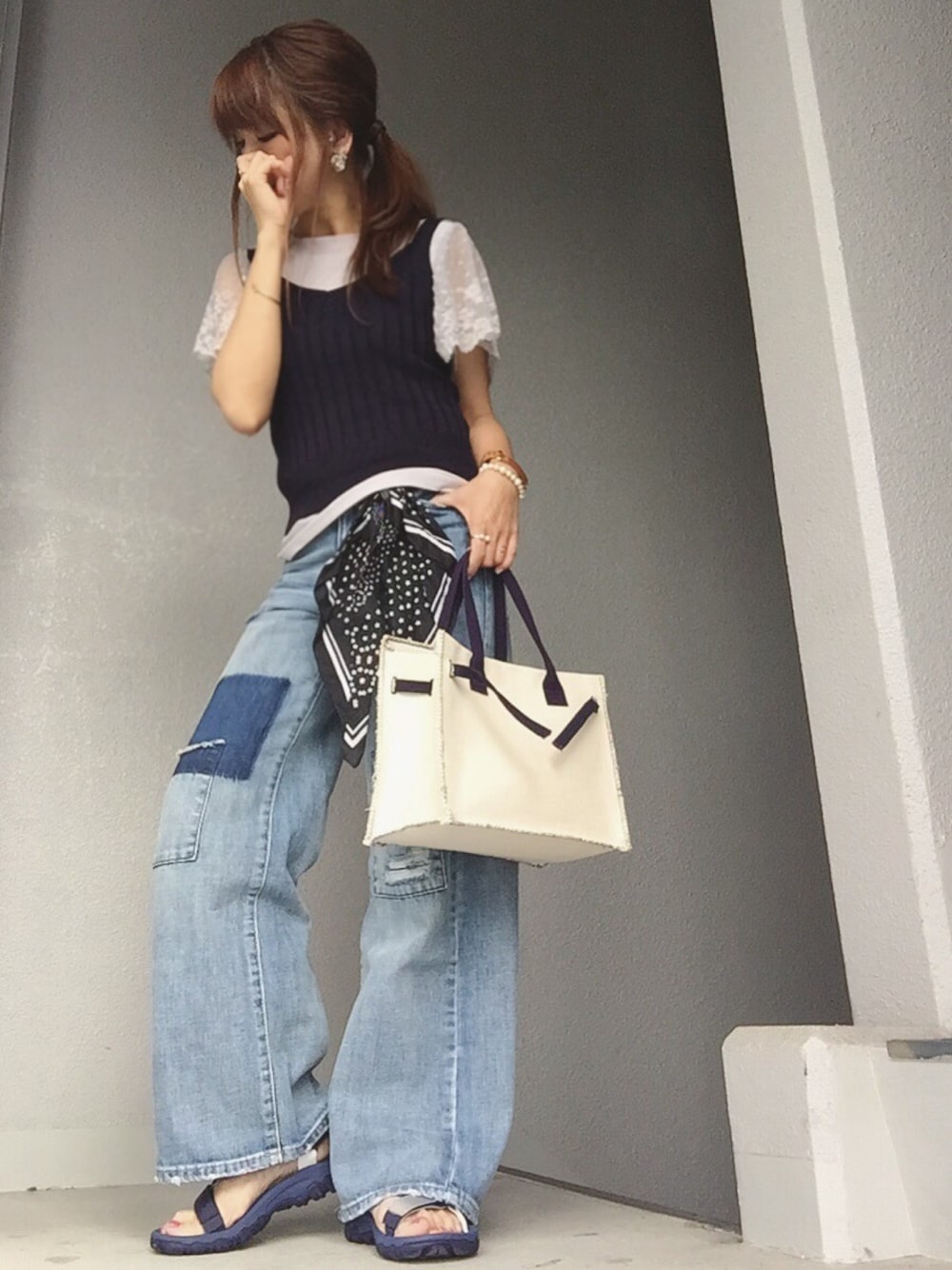 ワイドでパッチワークなんて、好み過ぎるデニム♥︎∗*゚ ホント可愛い〜❤ ずるずるっ~とルーズ過ぎないように、レースな袖が可愛い〜トップスと合わせました(*´³`*)♥︎ パープルっぽいグレーのトップスに、ネイビーなニットキャミ×デニムなワントーンコーデ♥︎∗*゚ Instagram:CHERY0131