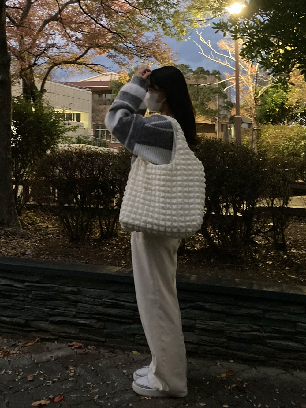 ご覧頂きありがとうございます·͜· 超久しぶりの投稿です!! 柄ニット×ホワイトパンツ可愛い( ᷇࿀ ᷆ ) バッグはメルカリで販売中です♡