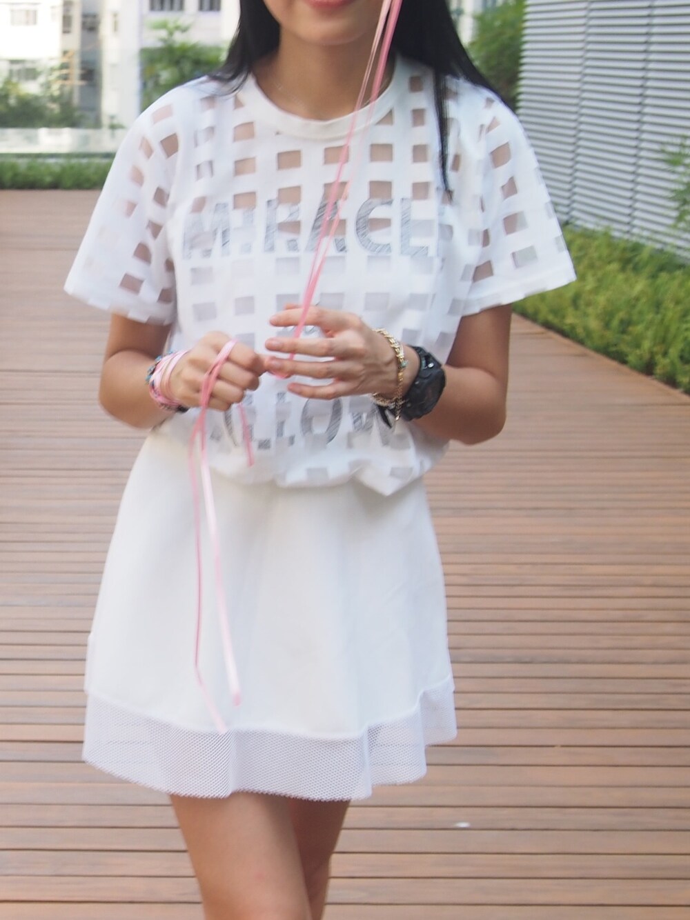 ブラック系のアナログ腕時計を着用したレディースの夏コーディネートの1枚目の写真