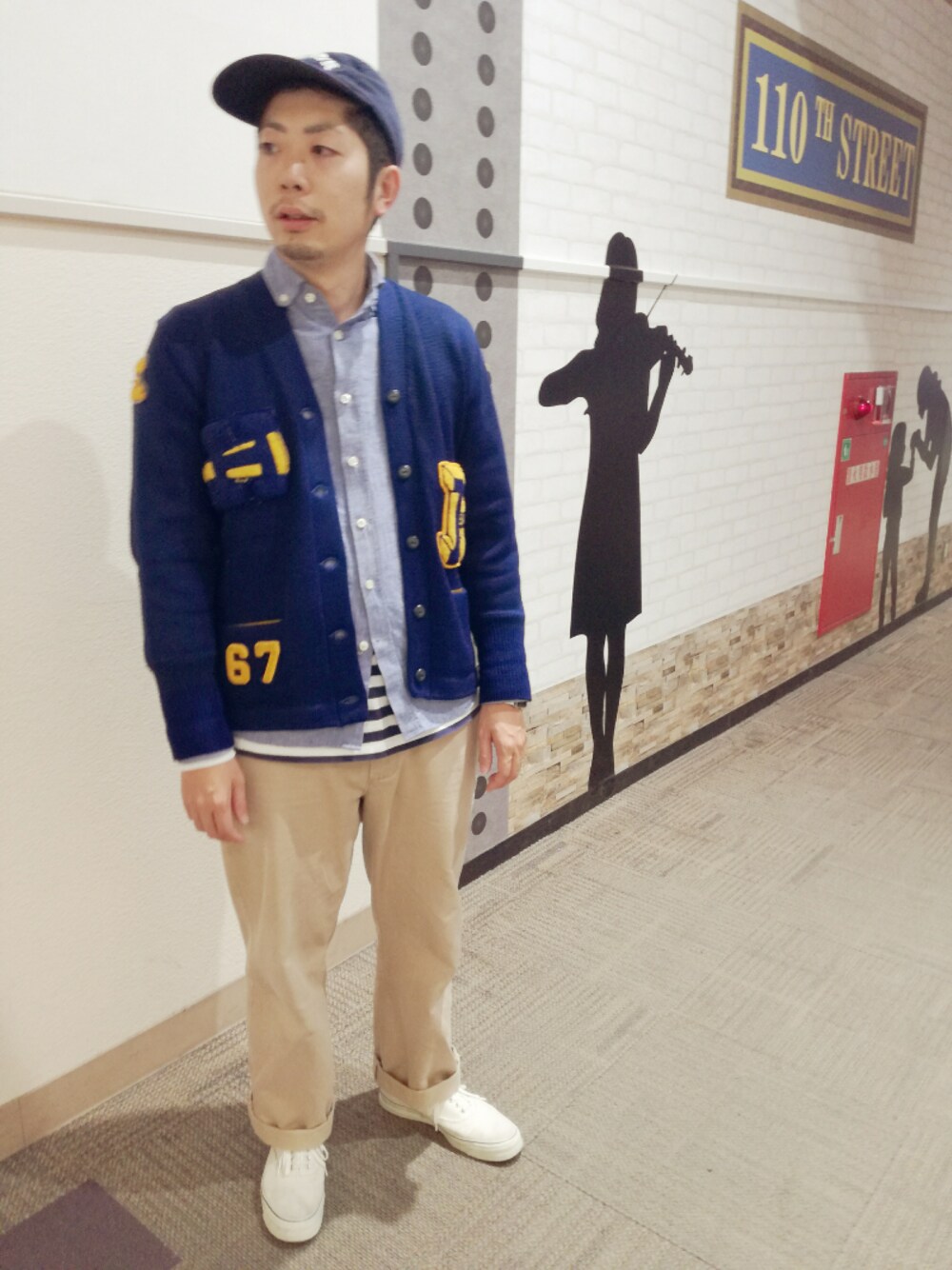 イオンモールのメインストリートにて SKOOKUMのレタードカーディガンが本日の主役です😃
