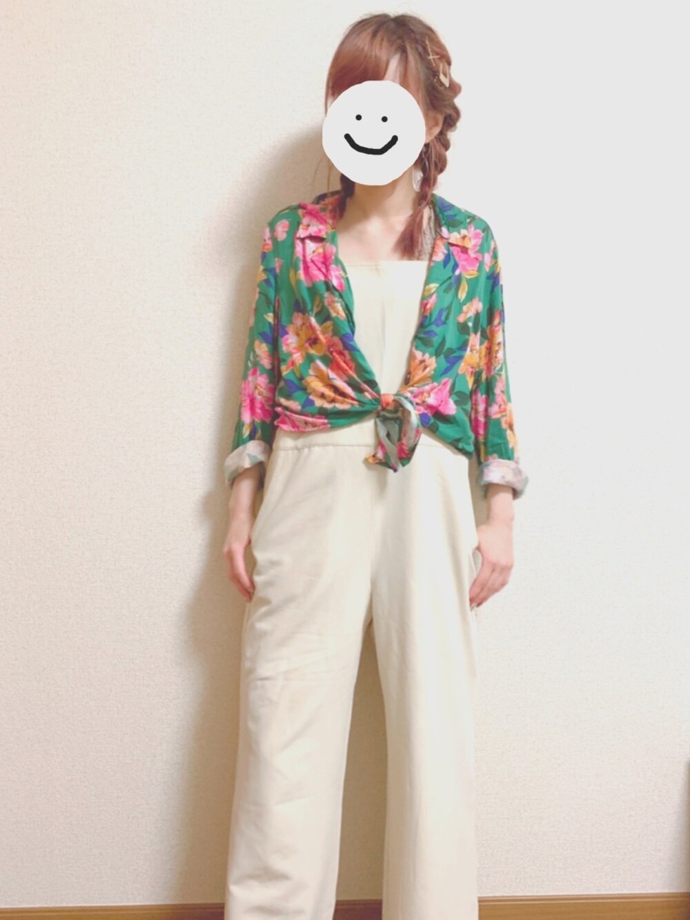 白のサロペットがずっとほしくてやっと理想の形のやつが見つかって即購入🥰 中はレースのタンクトップで、羽織りを脱いでも大丈夫なやつ🙆♀️ 肌寒いからポイントで花柄のシャツを✨ 今日は髪の毛も凝ったよ〜☺︎
