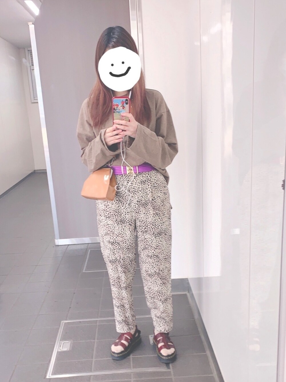 自粛前に買ったパンツやっと履ける日がきた😂 今日はアースカラーブラウンコーデ🤎 全体的にブラウンでまとめてサンダル合わせて抜け感を。 個人的にポイントで色を足すのが好きなので今日も紫の太ベルト☺︎