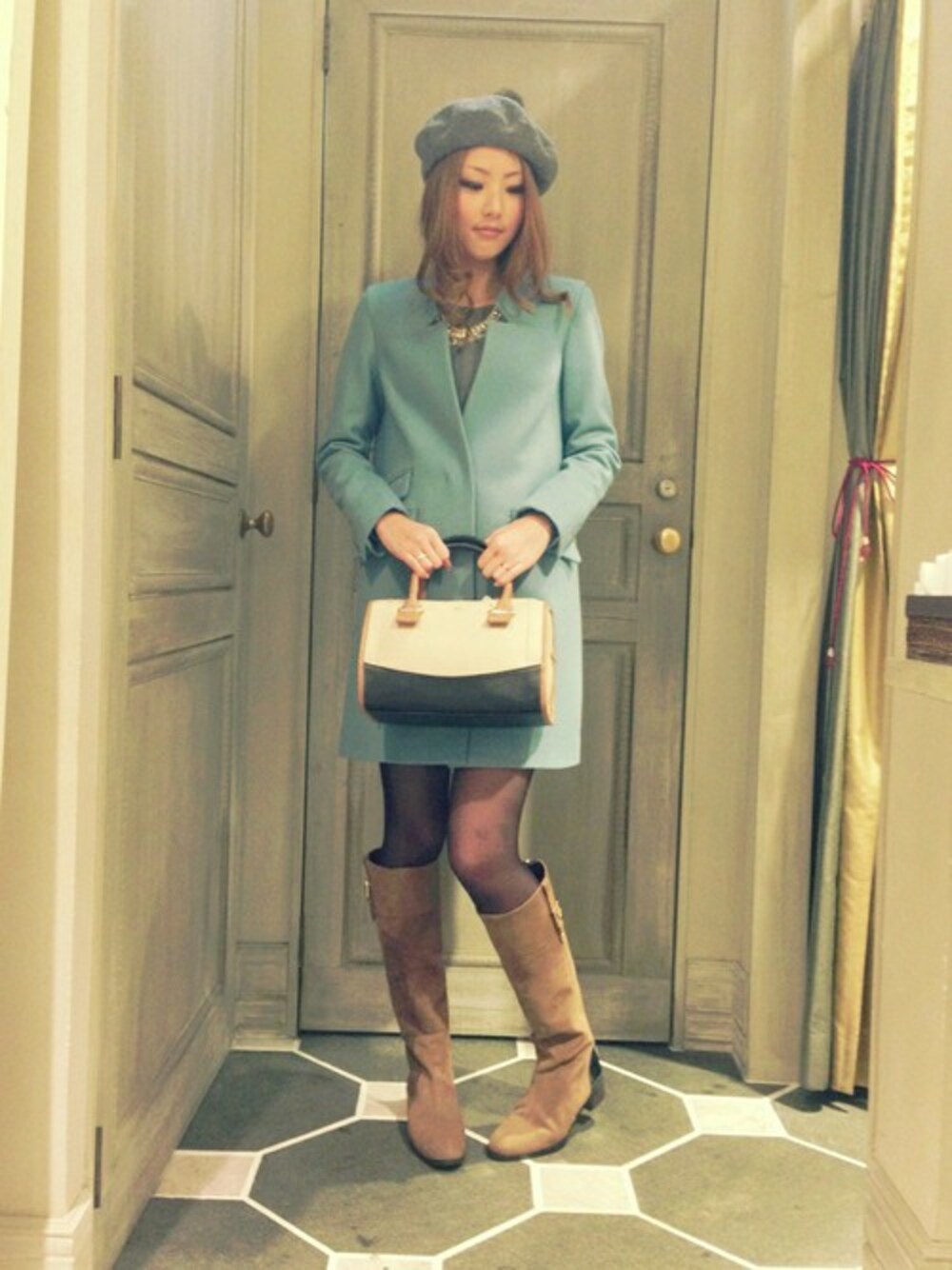 流行のパステルカラーで今年らしいコーディネート。 ブーツも淡めのベージュで合わせるとまとまります。