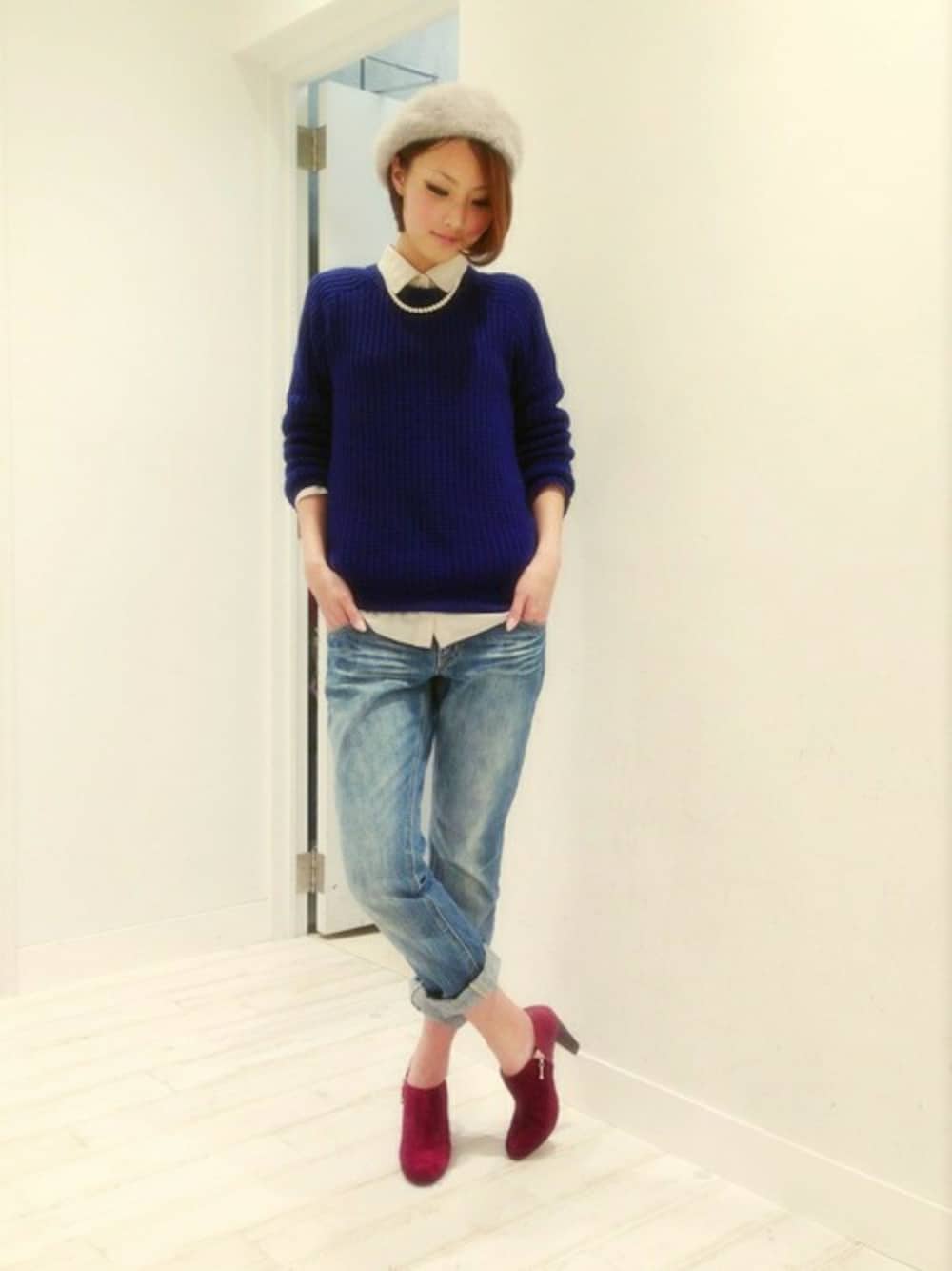 ブルーのニット×ワインのブーティコーデ。 カラーを合わせてもデニムを挟むと馴染みます!