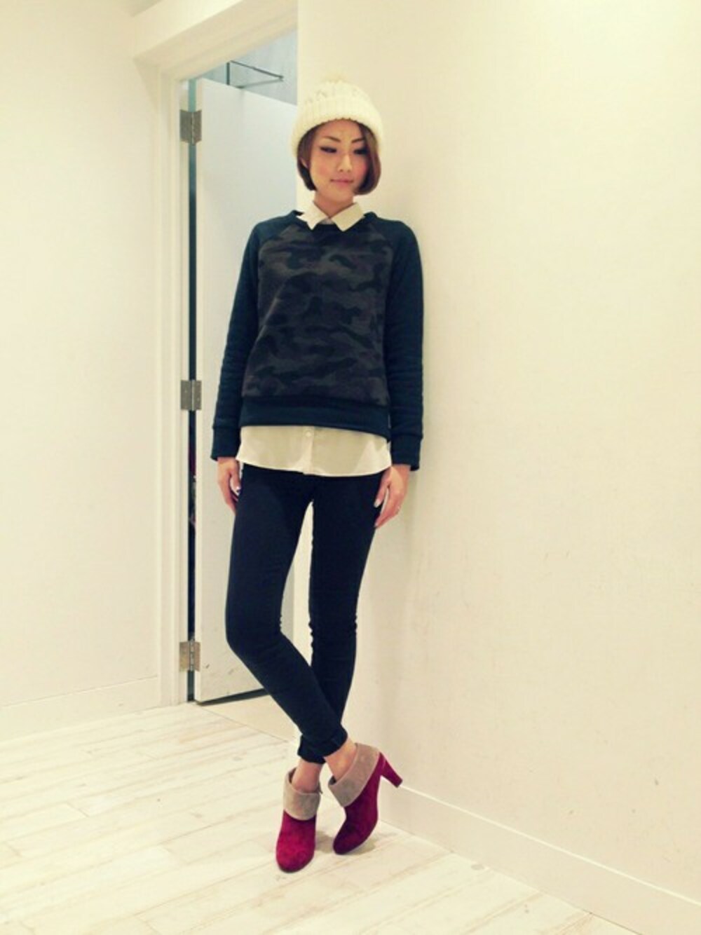 フェミニンなブーティも、カモフラ柄を合わせてカジュアルダウン! 綺麗過ぎるのが苦手な方にもオススメです。